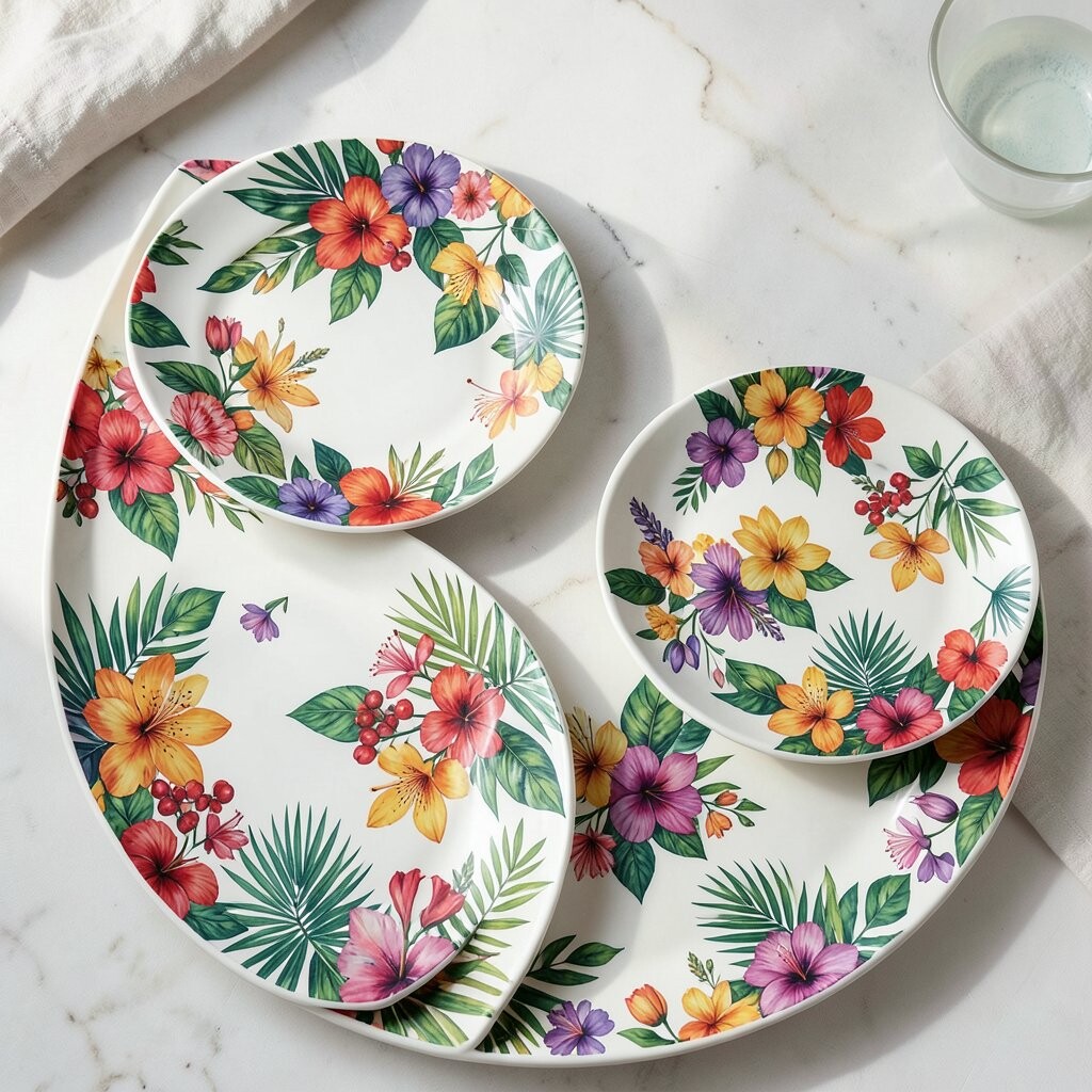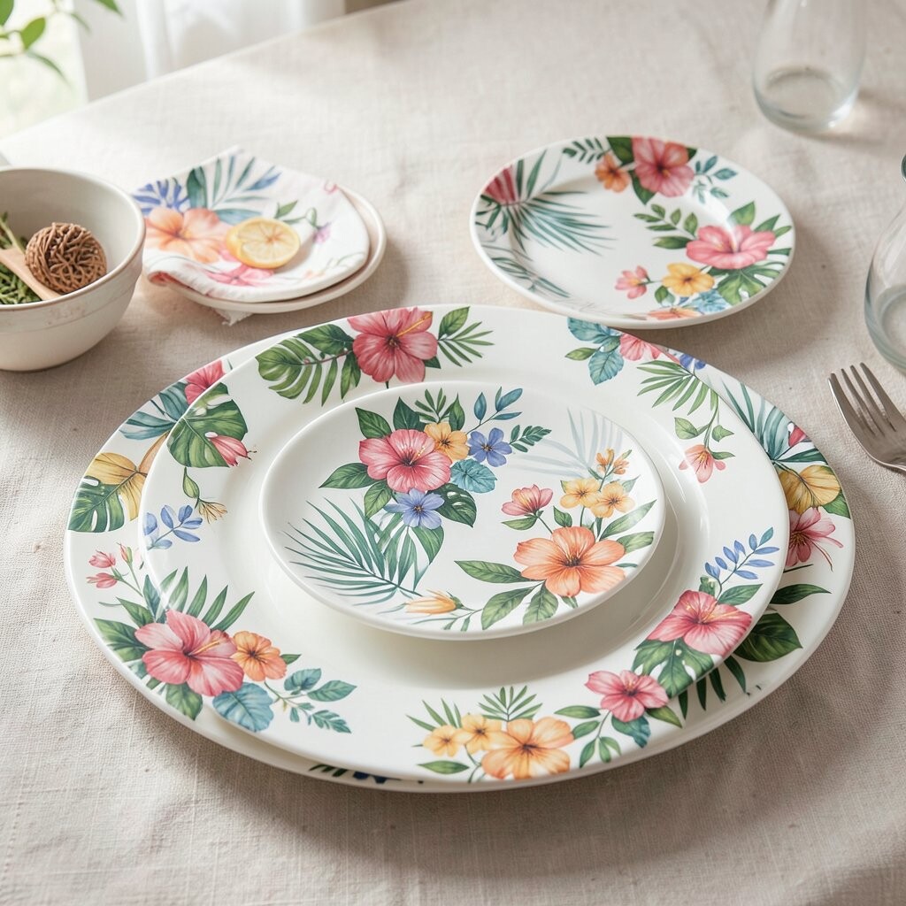 Add a splash of the tropics to your table with vibrant floral patterns. These plates are full of life, perfect for a summer brunch.
