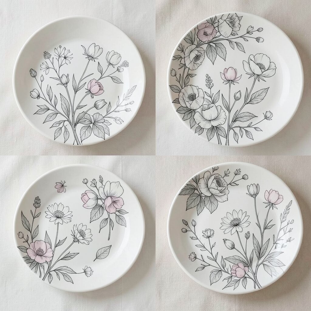 These plates feature floral designs that resemble pencil sketches. They’re artistic and contemporary, perfect for creative spirits.