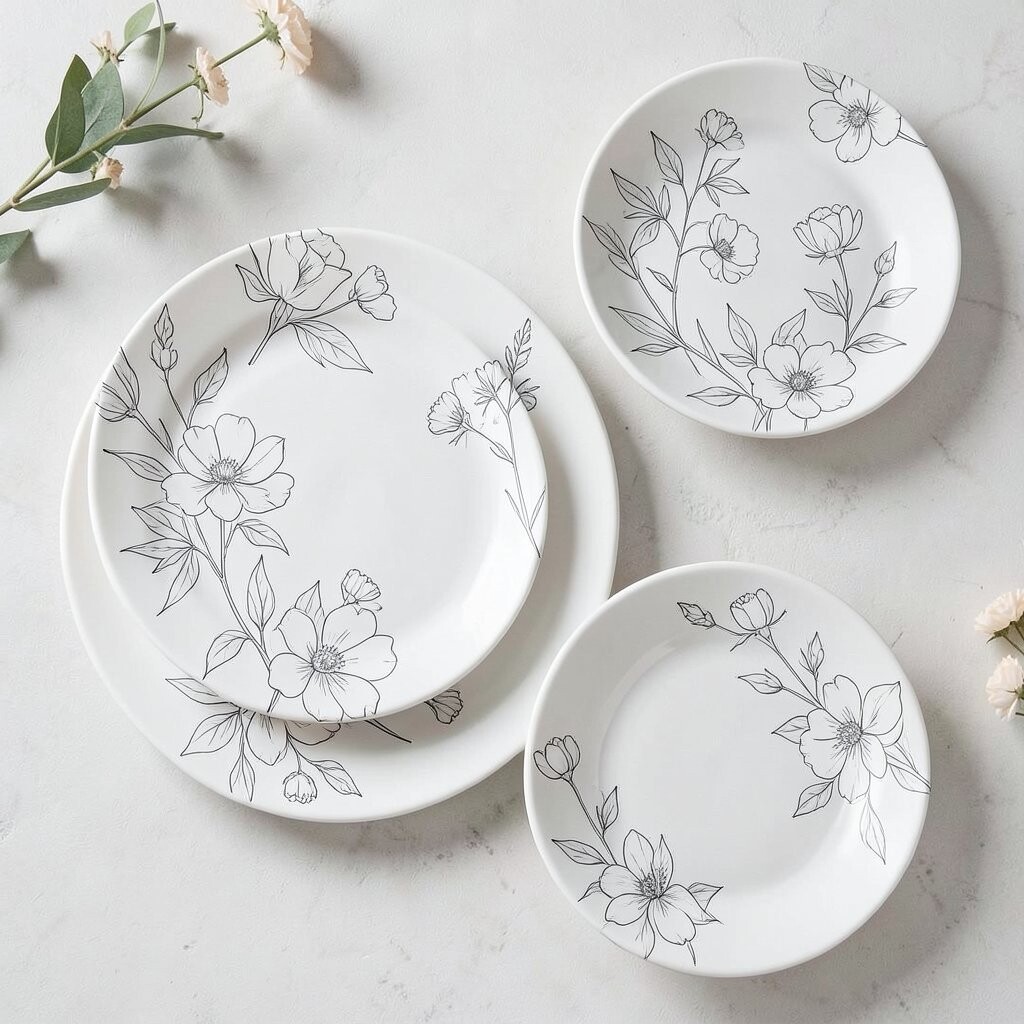 Simple yet stylish, these plates feature floral designs drawn with minimalist lines. They’re perfect for those who appreciate subtlety.