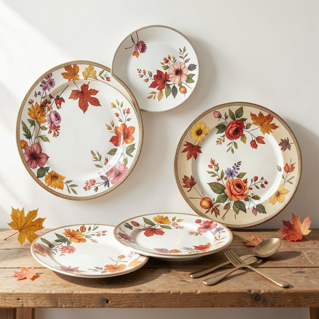 Capture the essence of fall with plates featuring rich autumnal florals. They’re warm, inviting, and perfect for the season.