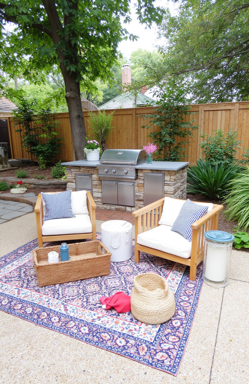 An outdoor rug adds color and comfort to your backyard kitchen. It ties the space together and makes it feel homey.
