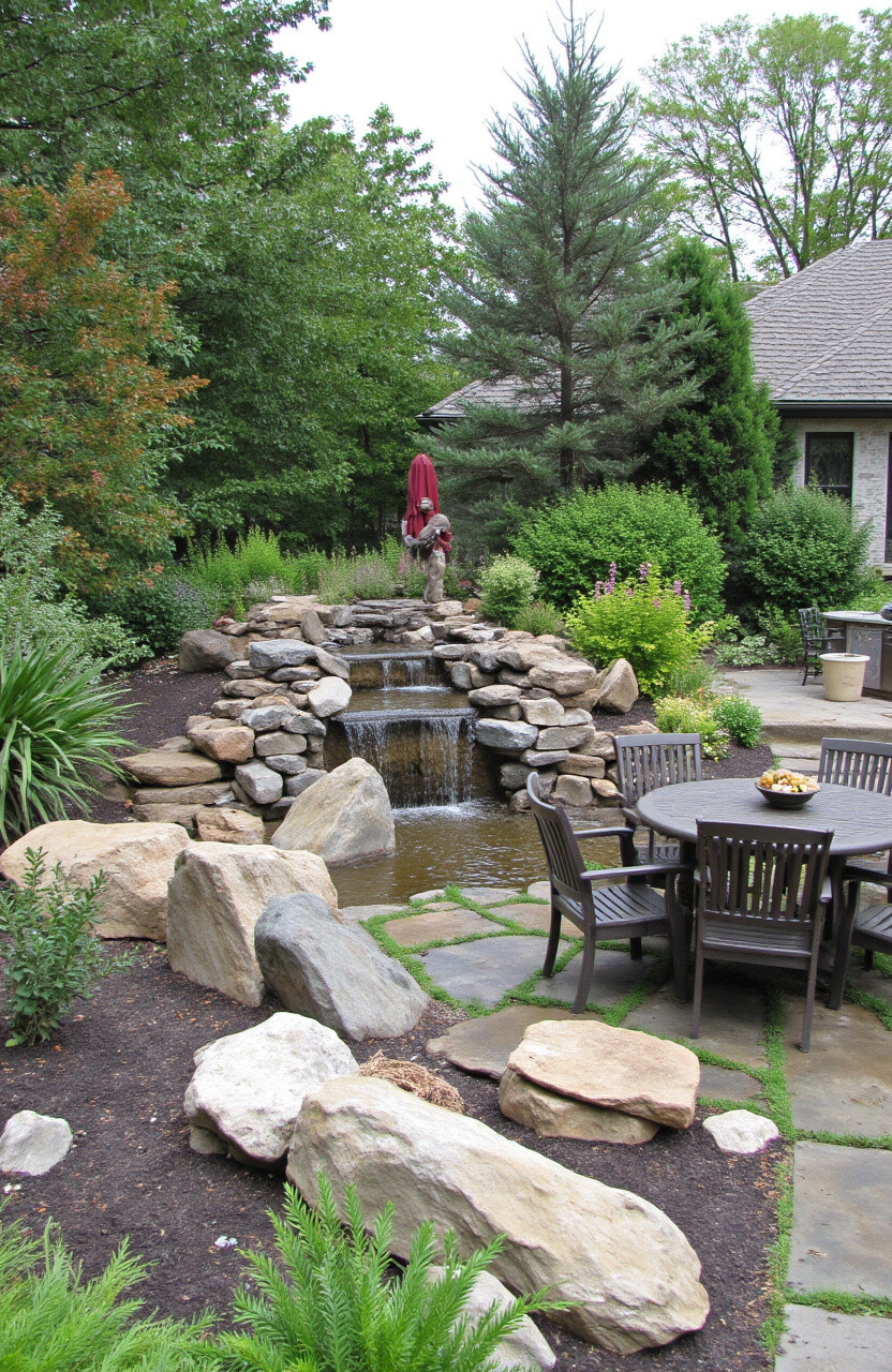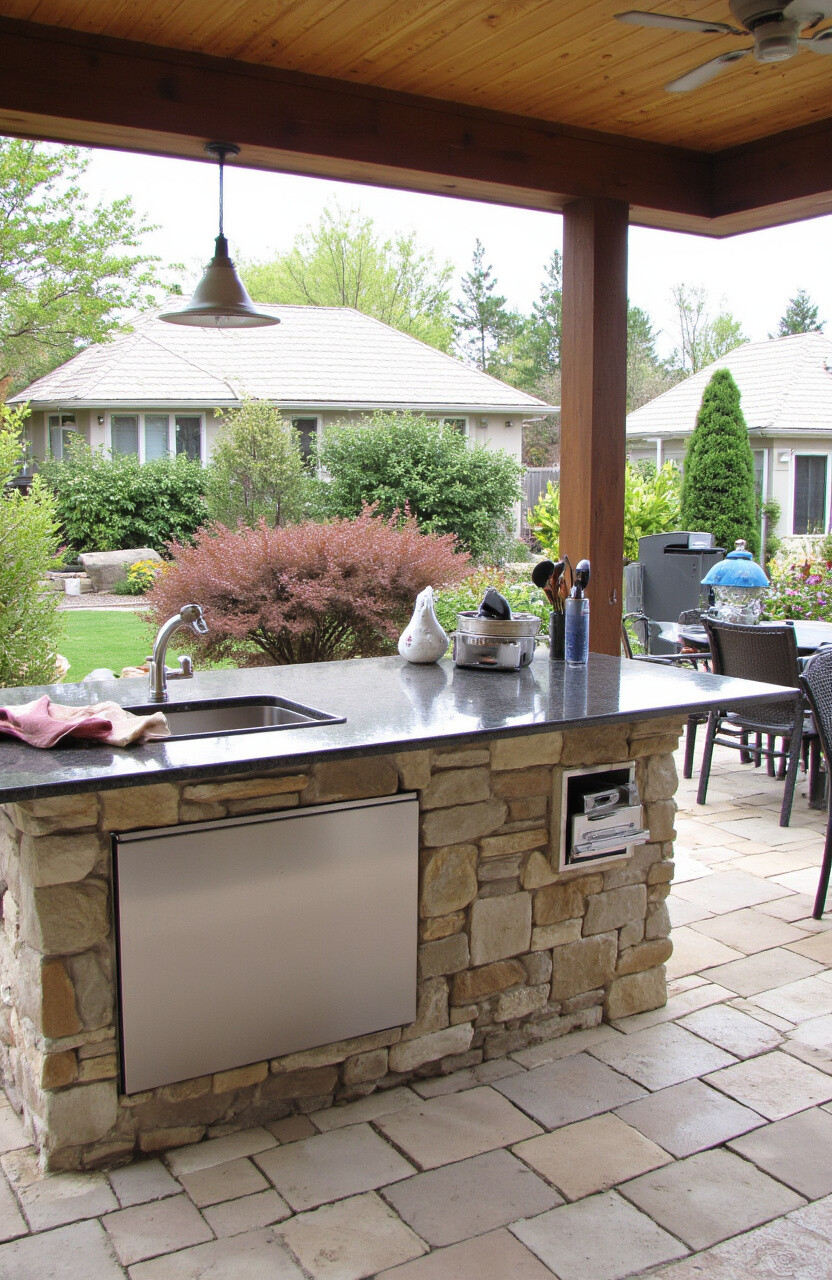 Add a touch of tranquility with a water feature near your kitchen. The soothing sounds of water enhance the outdoor dining experience.