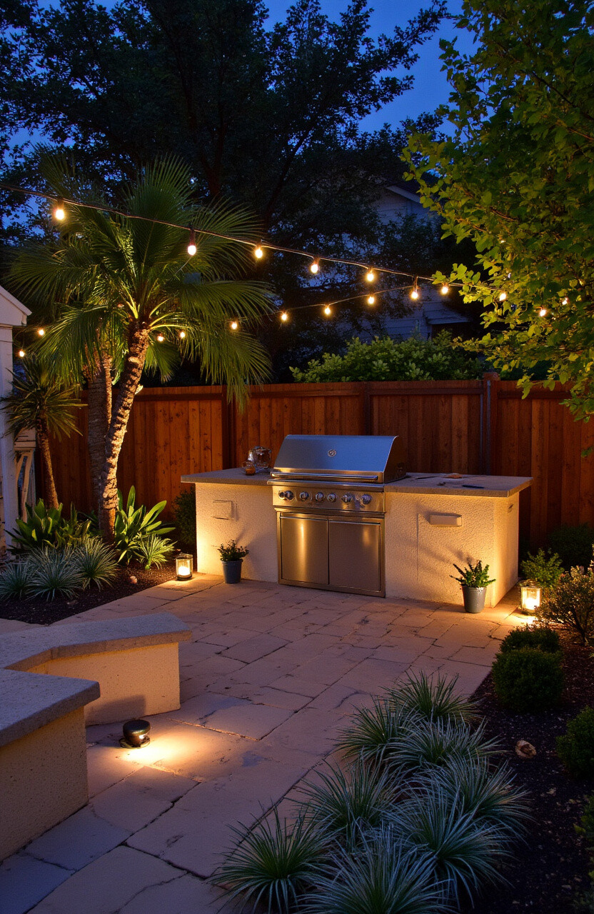 Lighting sets the mood for your backyard kitchen. Choose fixtures that match your style and provide ample light for cooking.