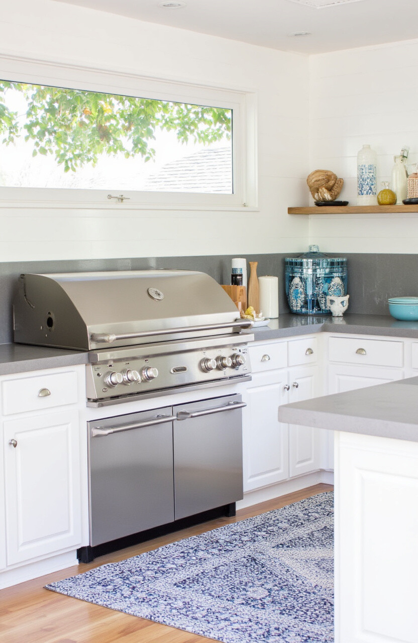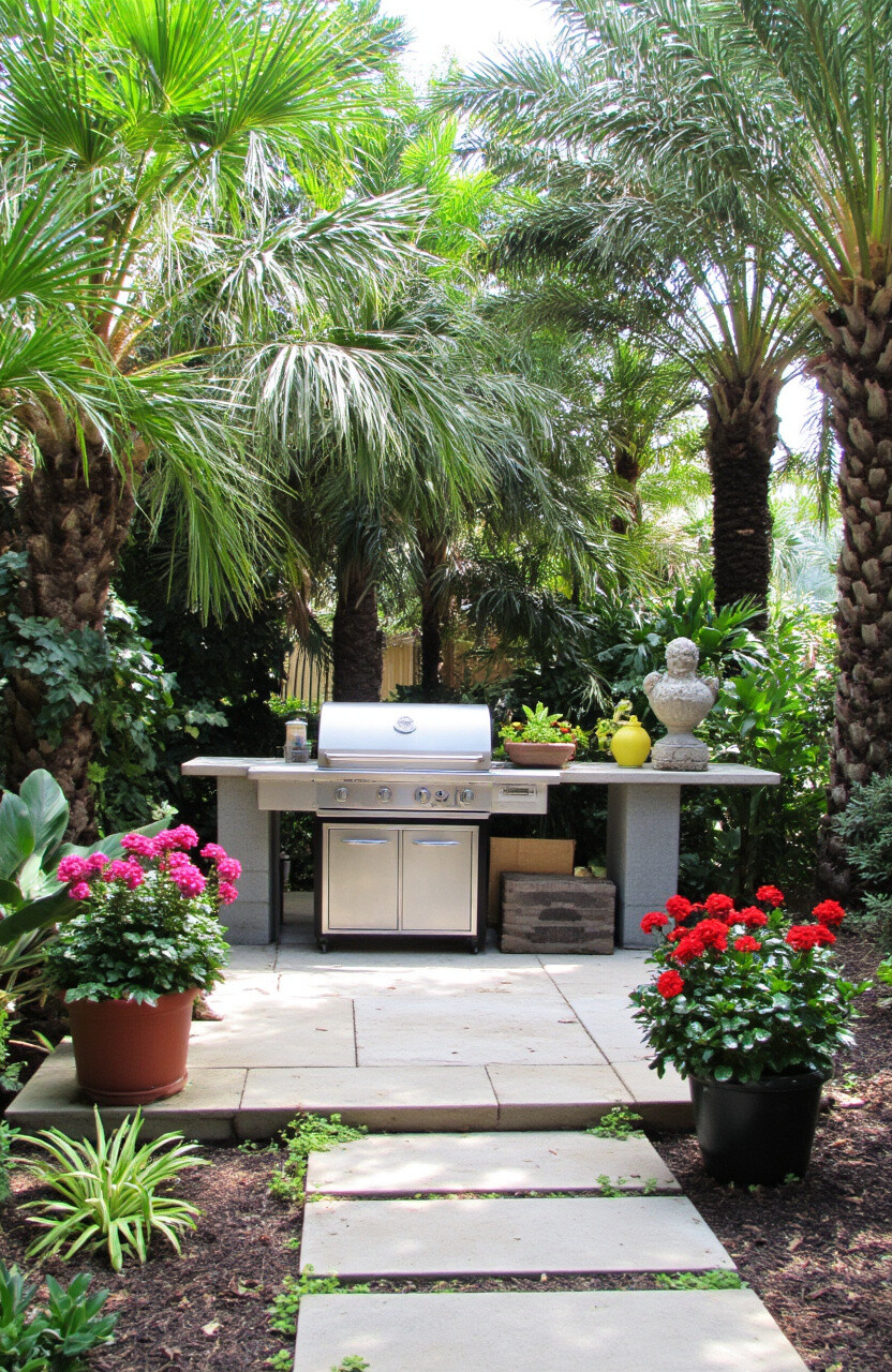 Create a tropical paradise right in your backyard. Use potted palms, vibrant flowers, and leafy greens to surround your grill kitchen. This lively setup feels like a vacation escape.