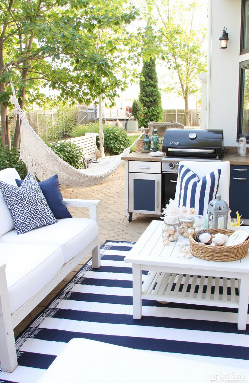 Turn your backyard into a coastal escape with nautical decor. Use navy blues, whites, and stripes to create a seaside vibe.
