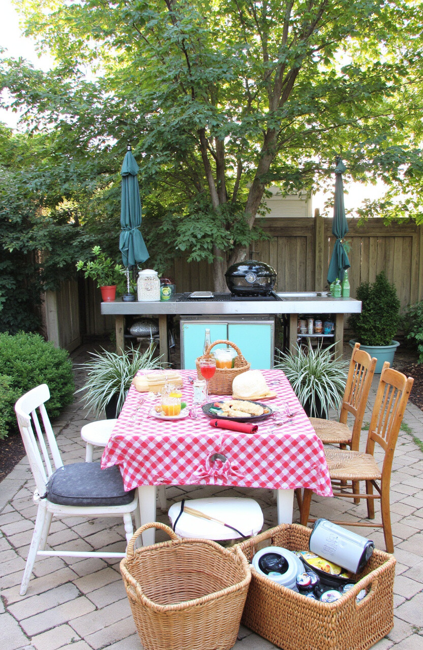 Create a charming picnic area with vintage touches. Use a checkered tablecloth, wicker baskets, and mismatched chairs for a nostalgic feel.