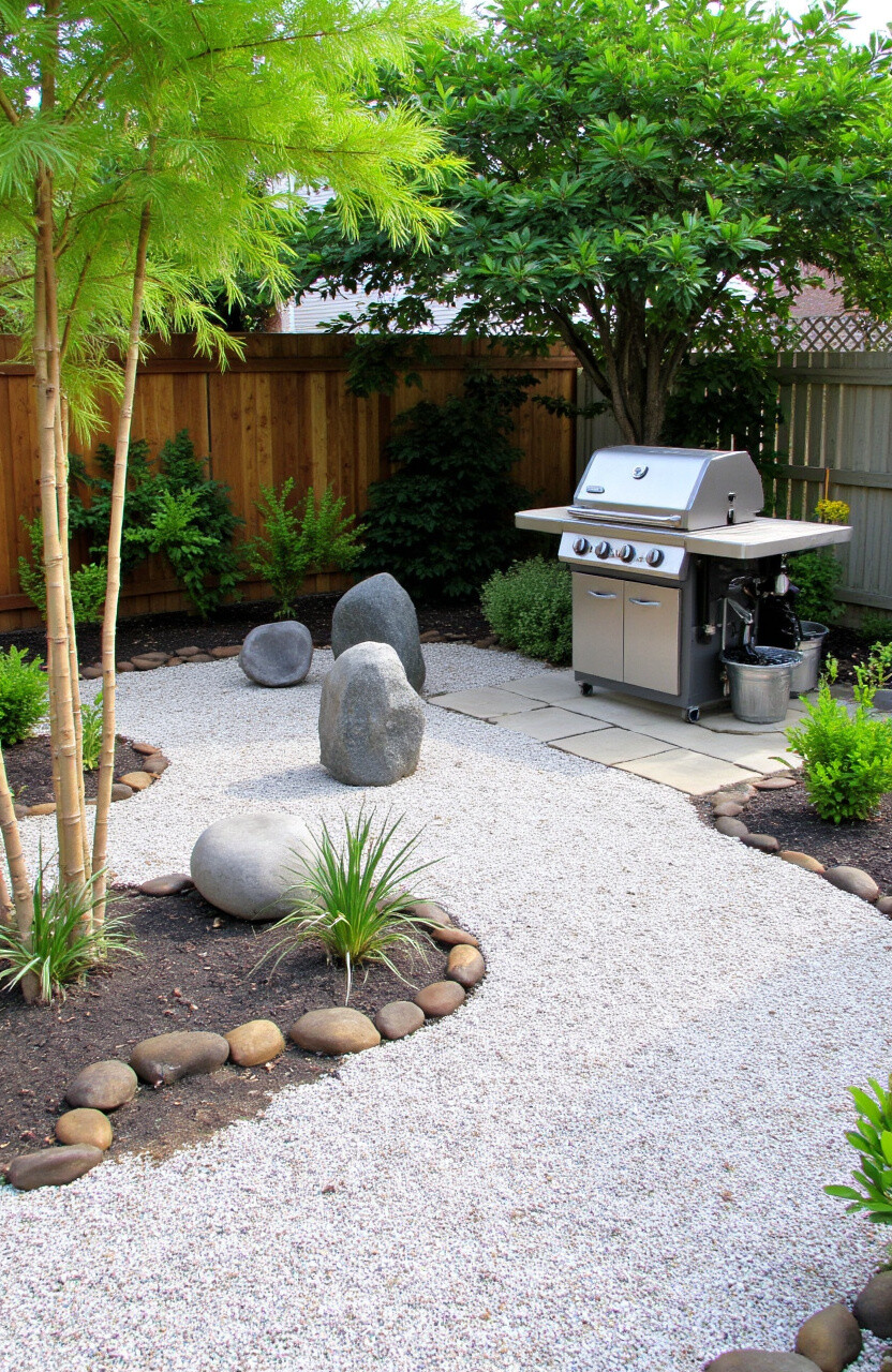 Find peace and tranquility in your backyard with a Zen garden. Raked gravel, stone sculptures, and bamboo plants create a calming atmosphere.