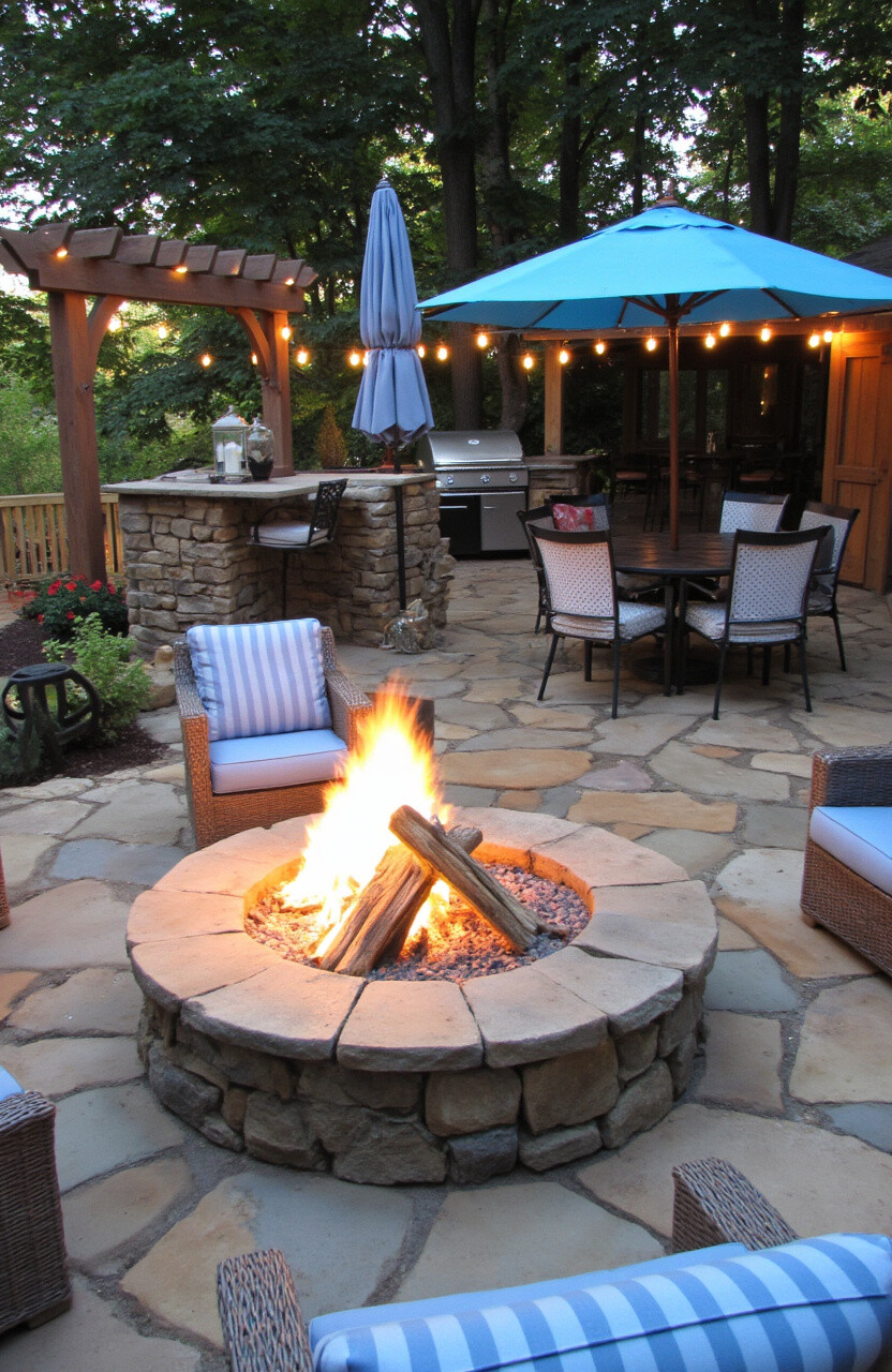 Choose a fire pit that complements your grill kitchen. Stone fire pits blend well with natural surroundings, while a sleek metal design offers a modern touch.