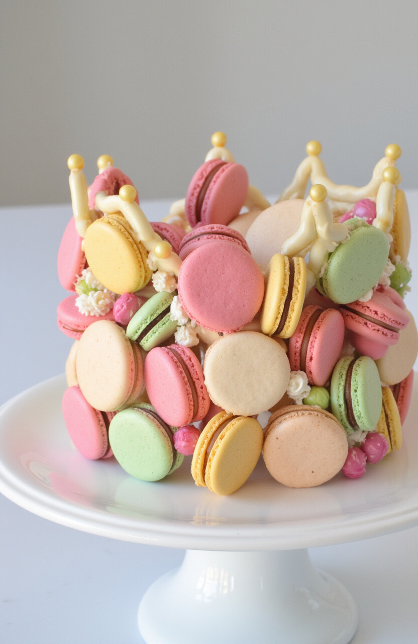 Stacking macarons into a crown shape requires a steady hand, but the result is worth it. You can mix flavors and colors to suit your theme. Though macarons can be pricey, their impact is unmatched.