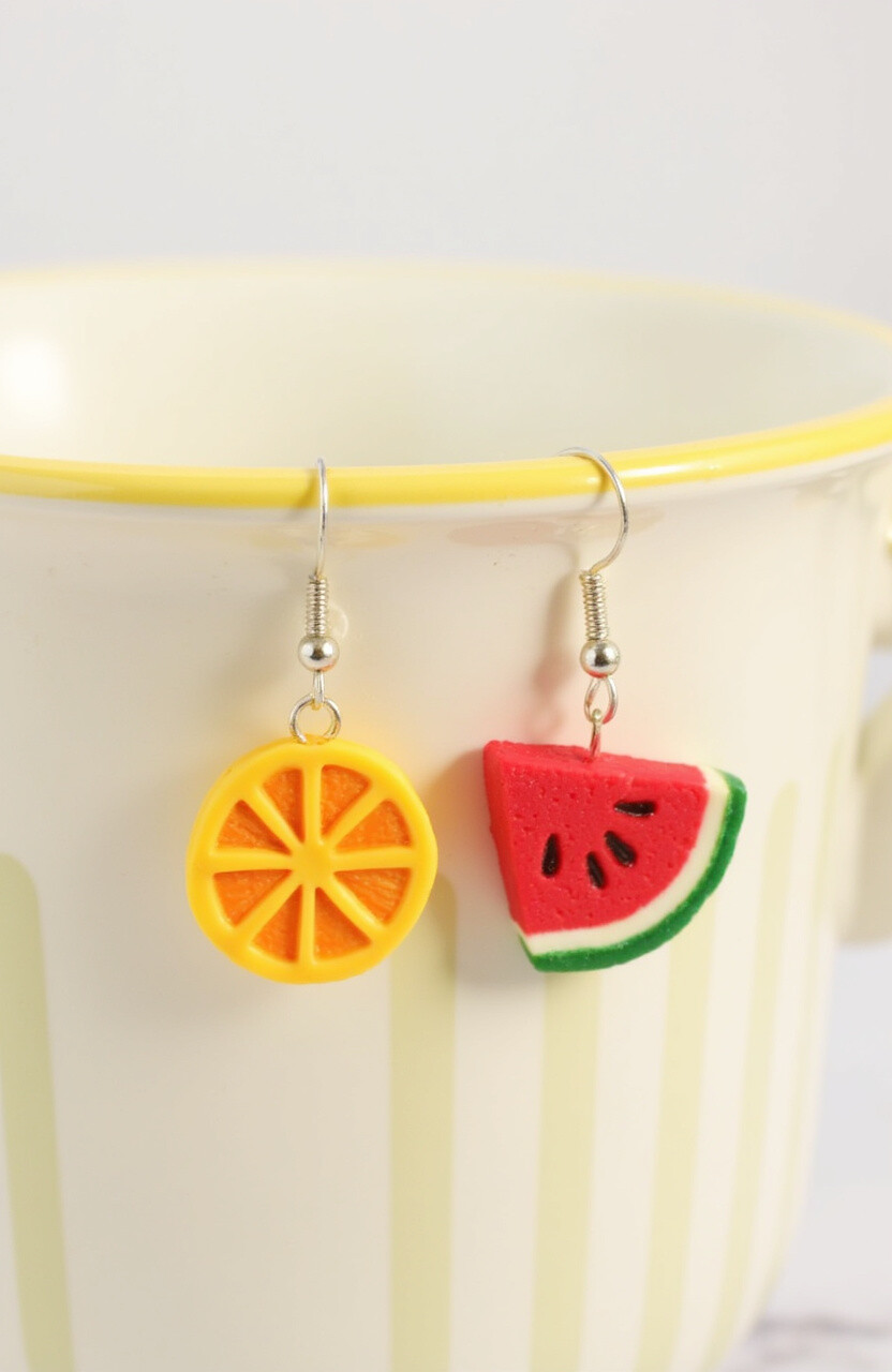 These charming earrings look just like tiny fruit slices! Picture wearing bright orange slices, juicy watermelon, or cheerful lemon slices on your ears. The colors are vibrant and fun, perfect for adding a pop of color to any outfit.