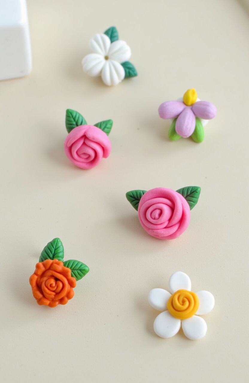 These are made using polymer clay, molded into tiny flower shapes. Once baked, they can be painted and glazed to add detail and shine. They’re perfect for adding a feminine touch to any look!