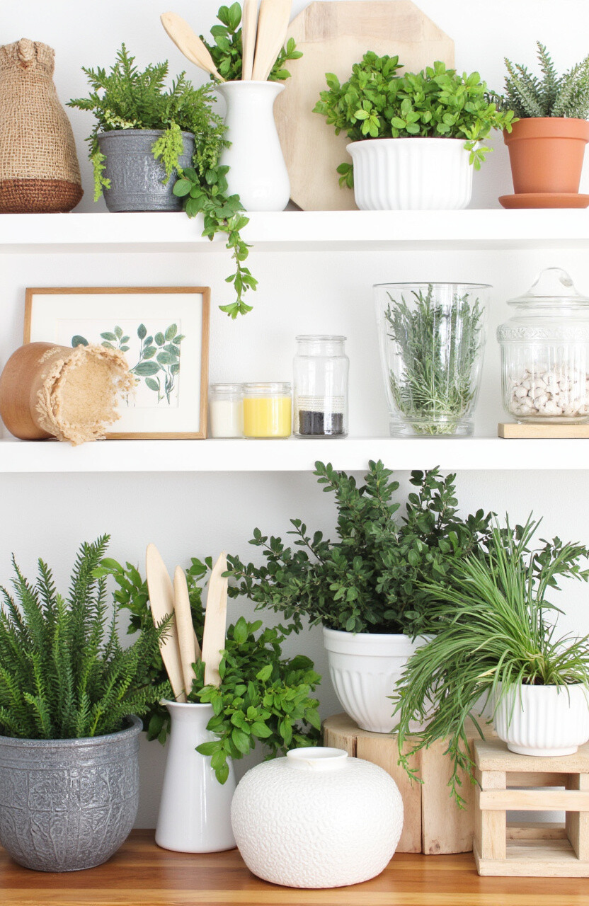 The benefit is a calming and refreshing atmosphere. Use potted herbs for both decoration and utility. Botanical themes can be achieved with budget-friendly plants and prints, making it an affordable option.