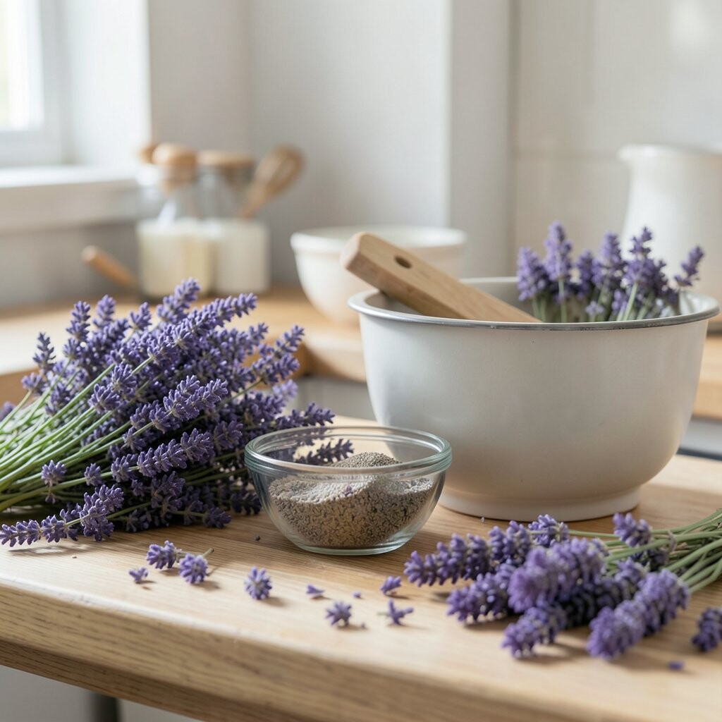 Lavender pairs well with white or grey for a sophisticated look. You can add lavender-scented candles or a vase of fresh lavender sprigs to enhance the calming vibe.