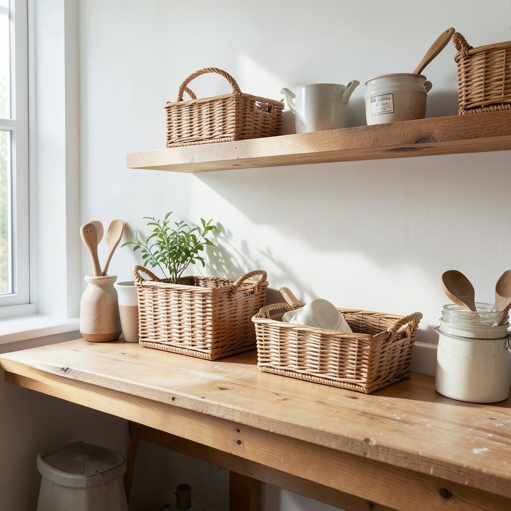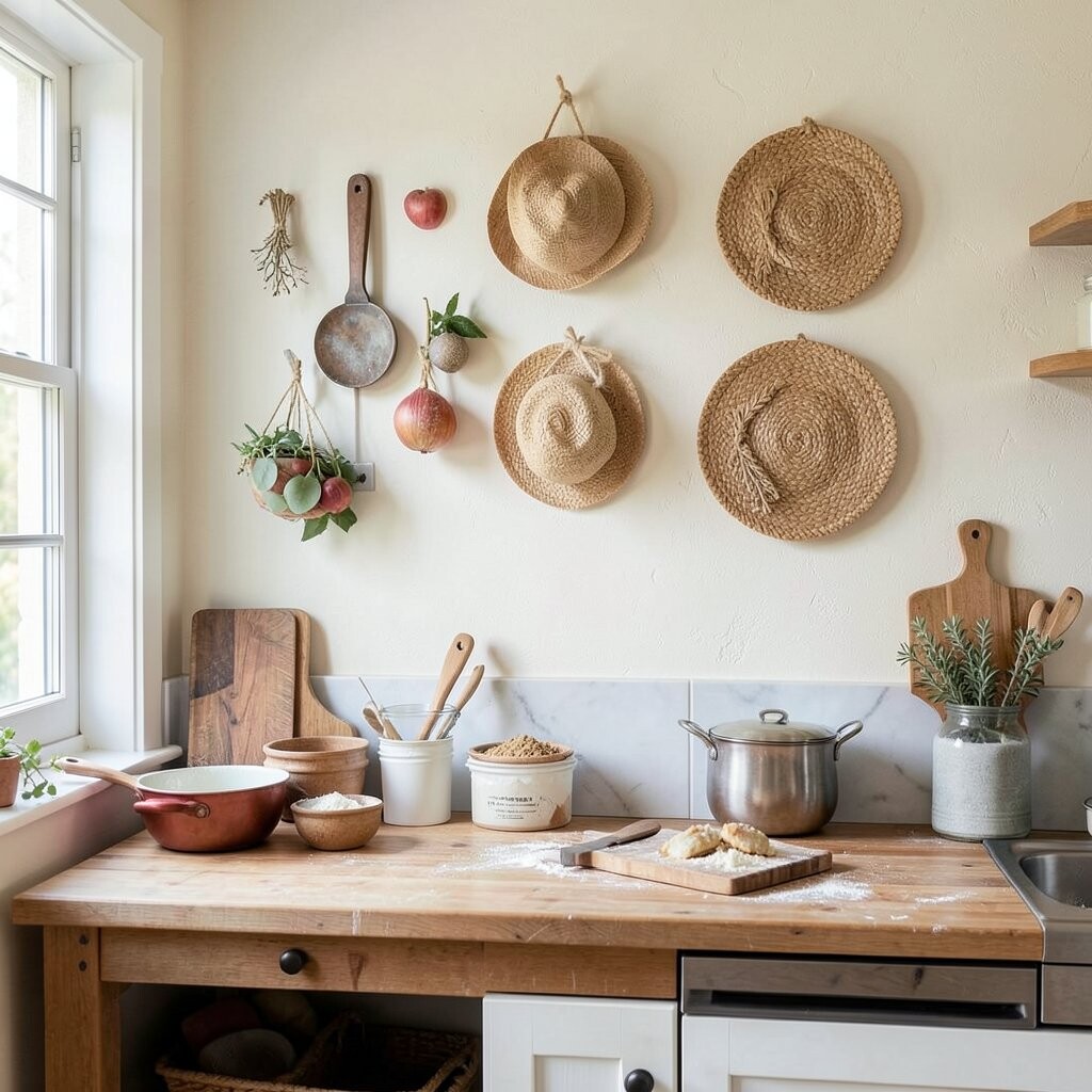 Woven baskets add texture and warmth to your kitchen walls. Use them to store fruits, utensils, or towels.