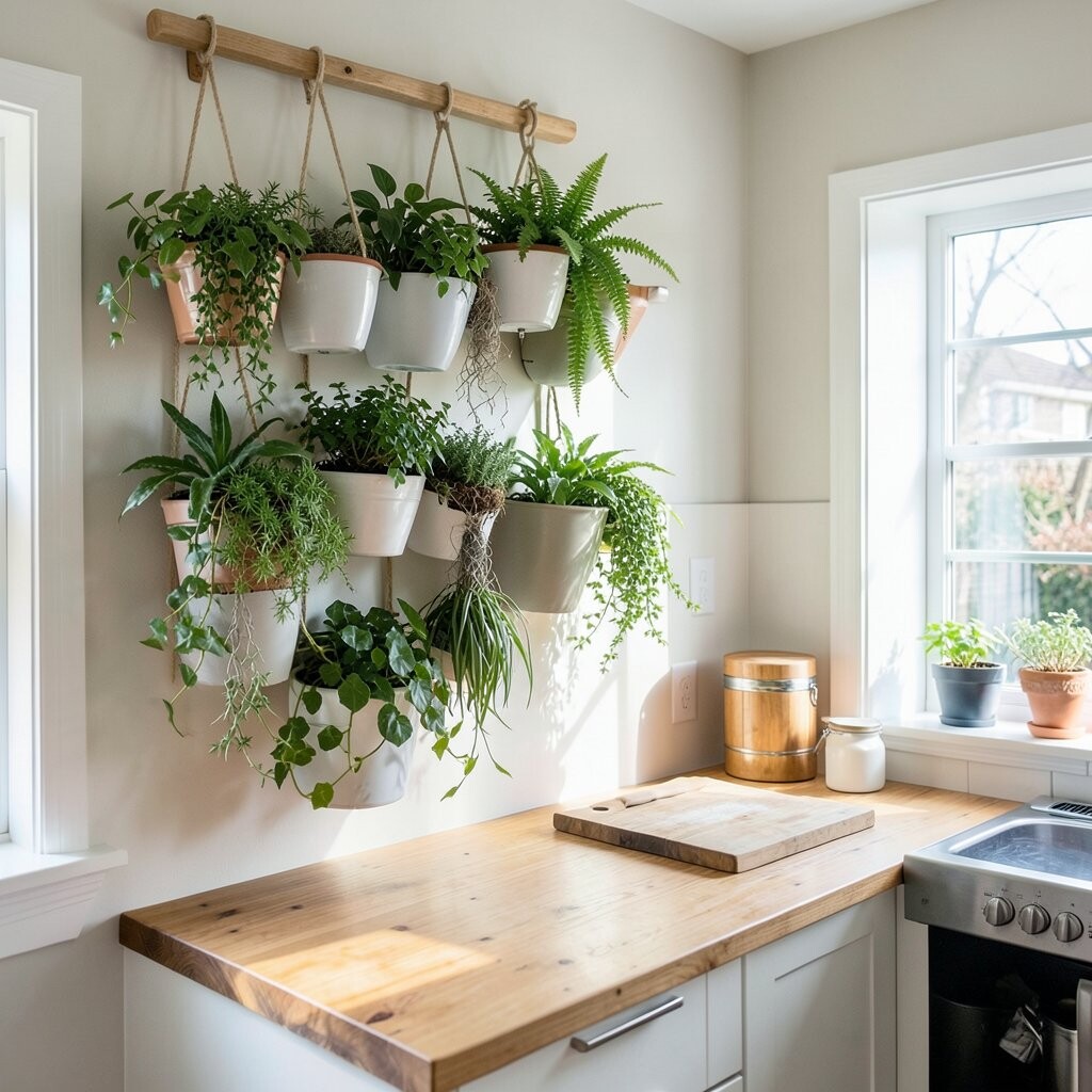 Choose plants like pothos or ferns that thrive in kitchen environments, creating a lush and calming atmosphere.