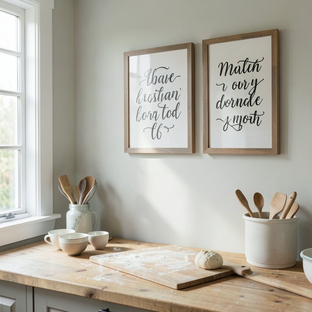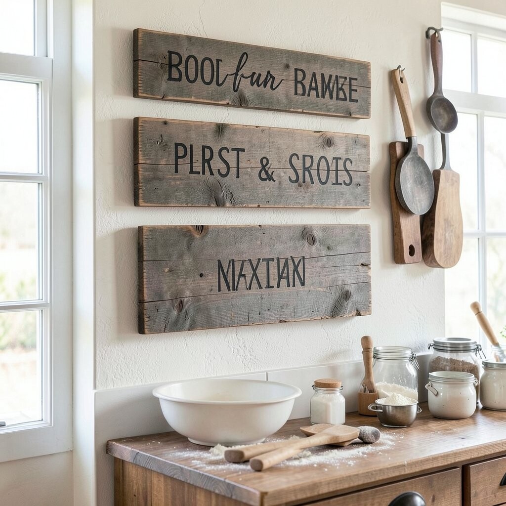 Bring a bit of countryside charm into your kitchen with rustic wooden signs. They add warmth and a personal touch.