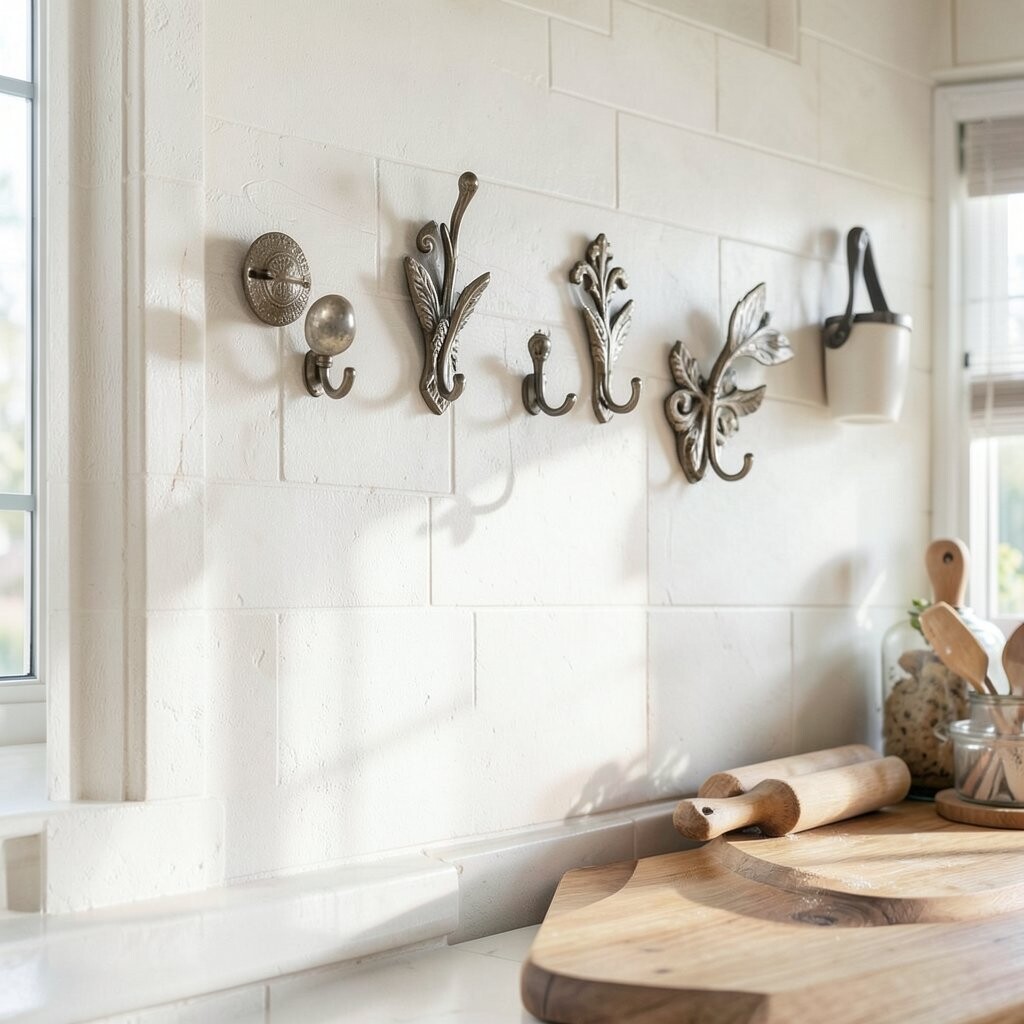 Wall hooks aren’t just for coats. Use decorative hooks to hang oven mitts, aprons, or even small pots and pans.