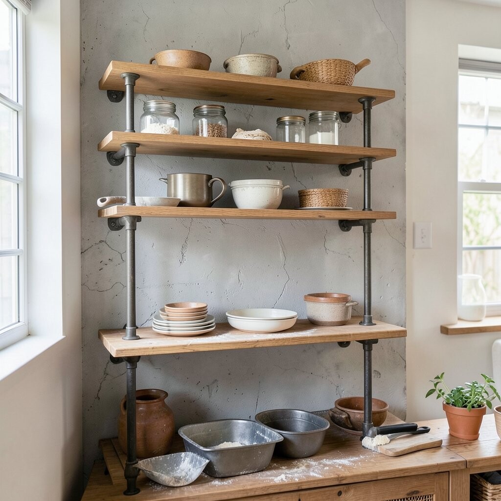 Industrial pipe shelving offers a rugged and stylish way to organize your baking tools. The mix of metal and wood adds a modern yet rustic feel.