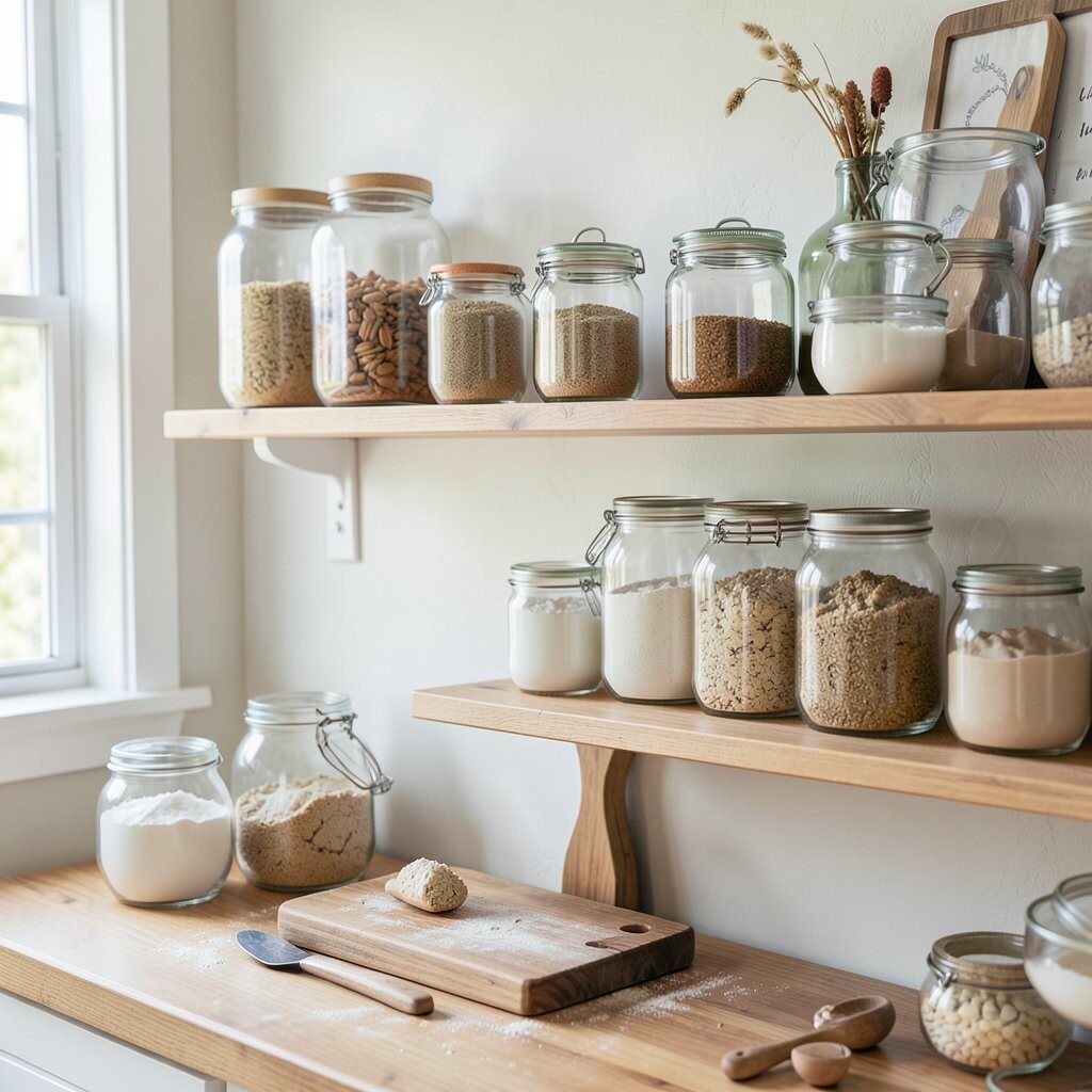 Glass jars filled with colorful ingredients can turn a wall into a rainbow of possibilities. Display flour, sugar, and baking powder in clear jars for a vibrant look.