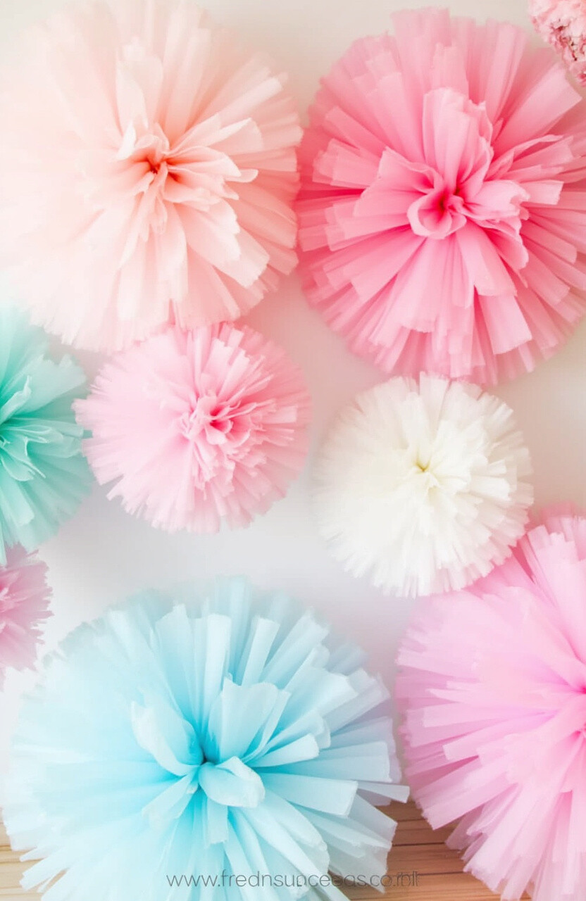 Making them is easy. Wrap tulle around a cardboard template, tie it in the middle, and fluff it out. They can be hung from ceilings, walls, or even used as party favors.