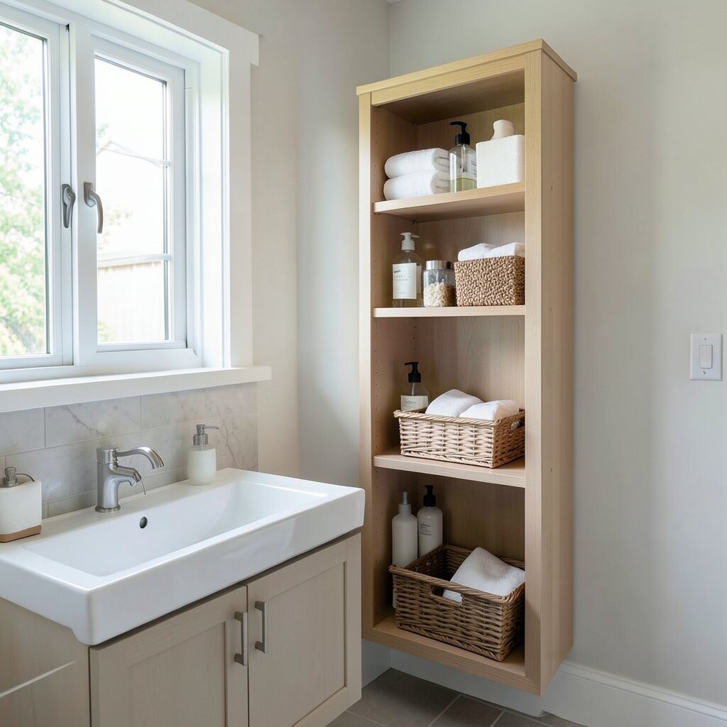 This kind of storage feels smart because it uses the room in a careful way. It can also make a bathroom look more finished and less empty.
