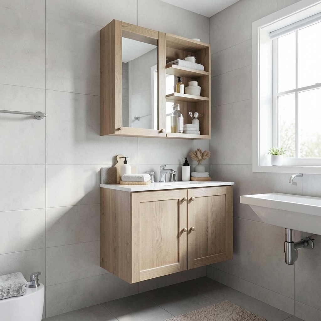 A mirror cabinet gives you storage and a mirror in one smart piece. It is perfect for toothpaste, medicine, skincare, and other daily items.