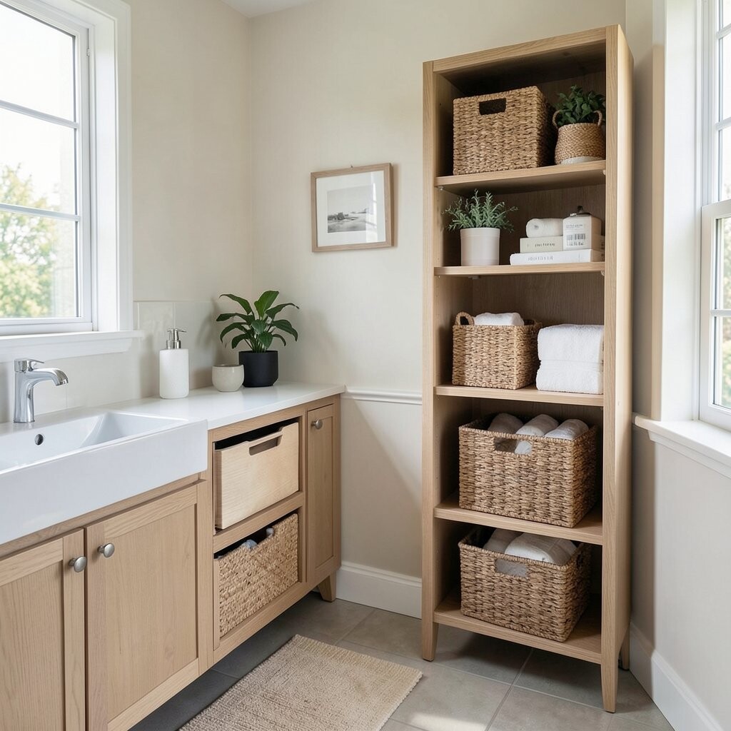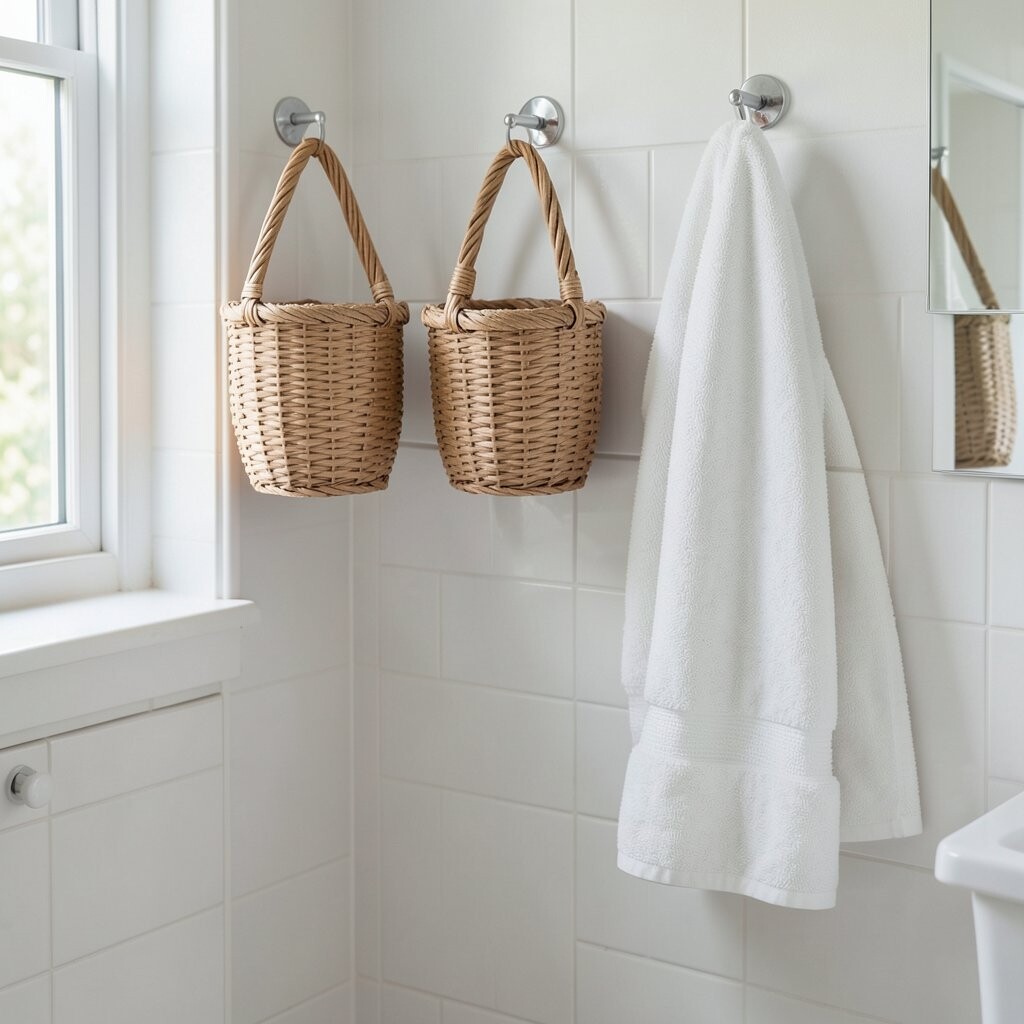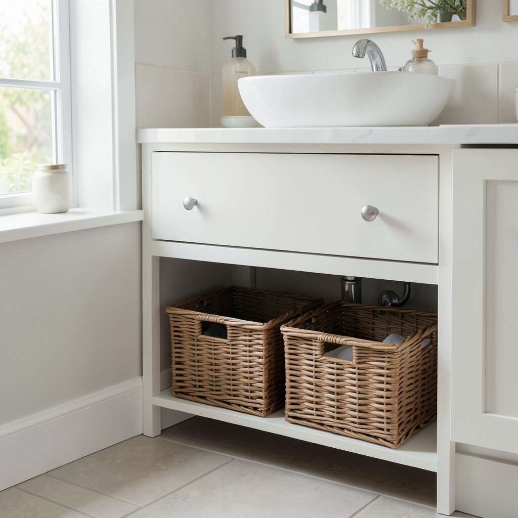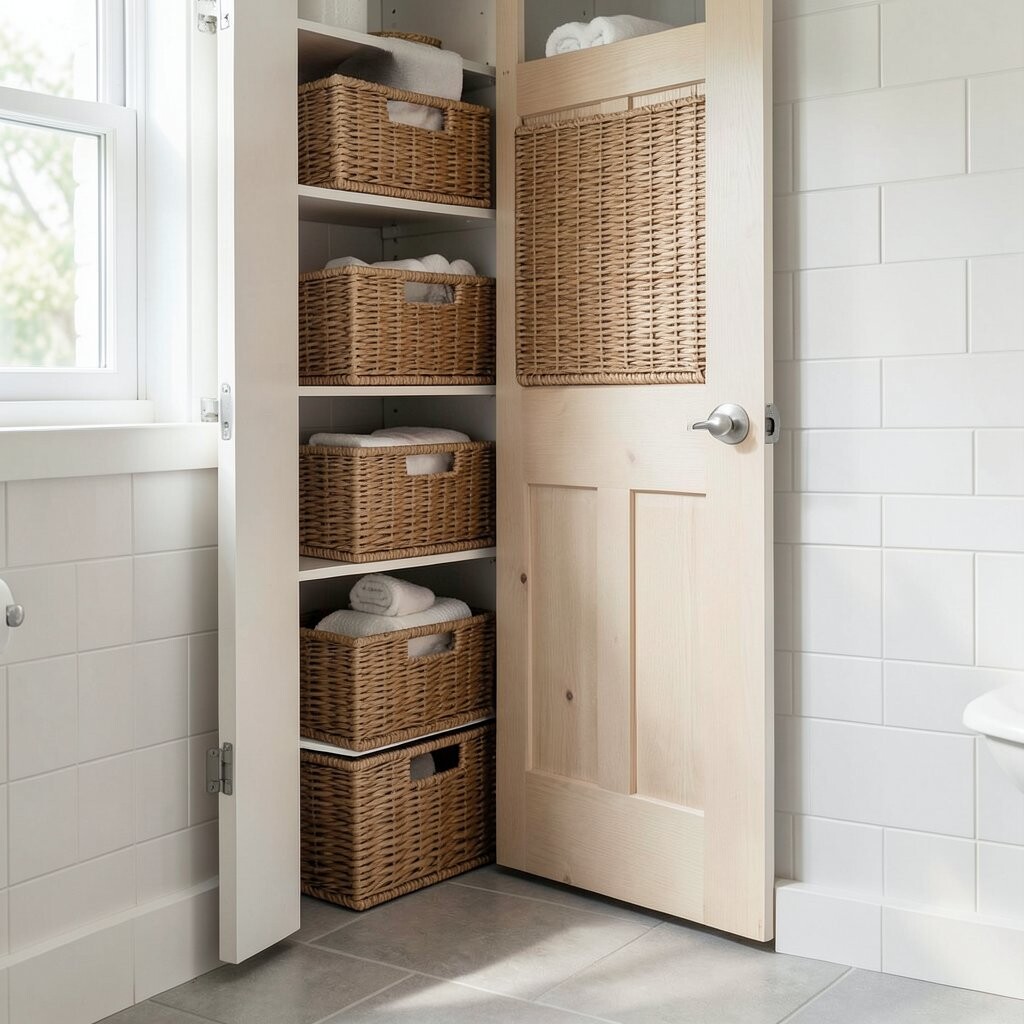 Try matching baskets for a neat look or a mix of sizes for a playful style. It is a low-cost idea that works well in tiny bathrooms and busy family spaces.
