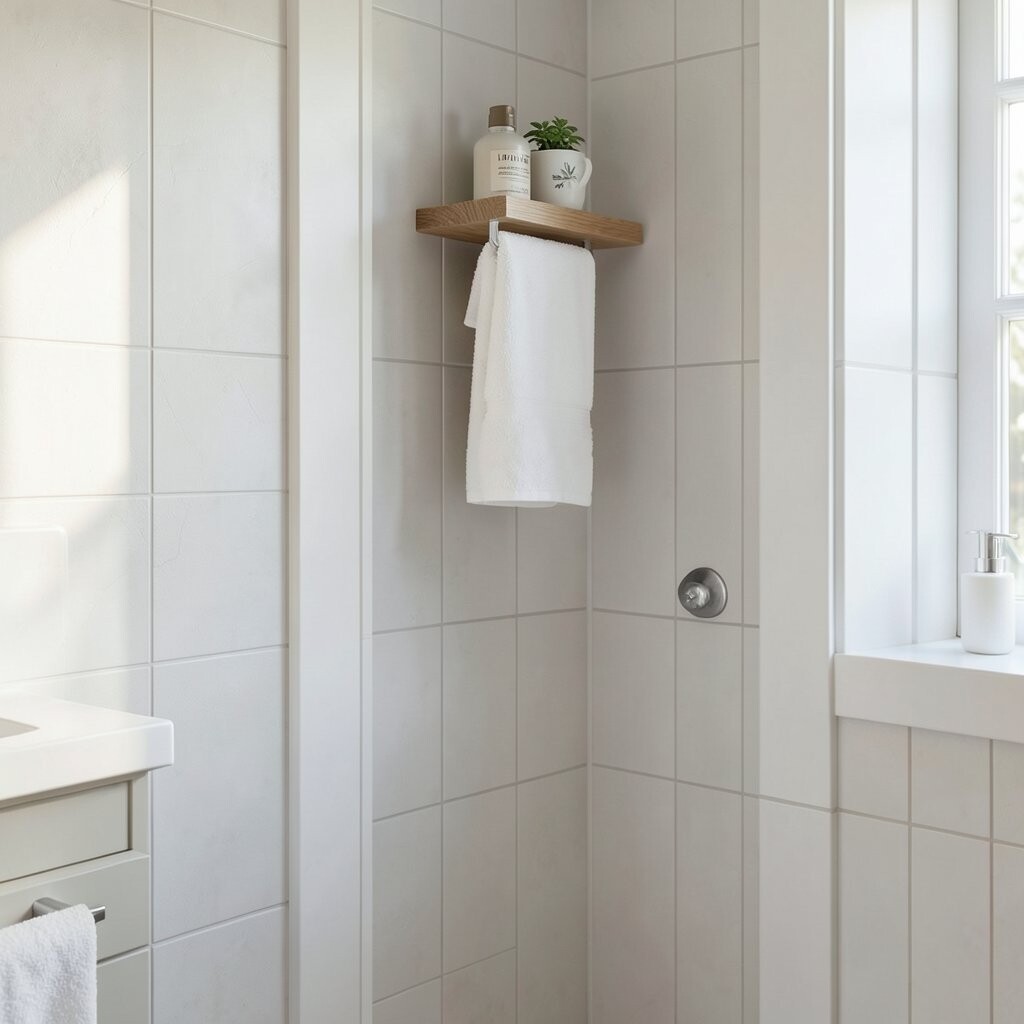 A shelf above the door uses space that is often forgotten. It can hold spare towels, baskets, or items you do not need every day.