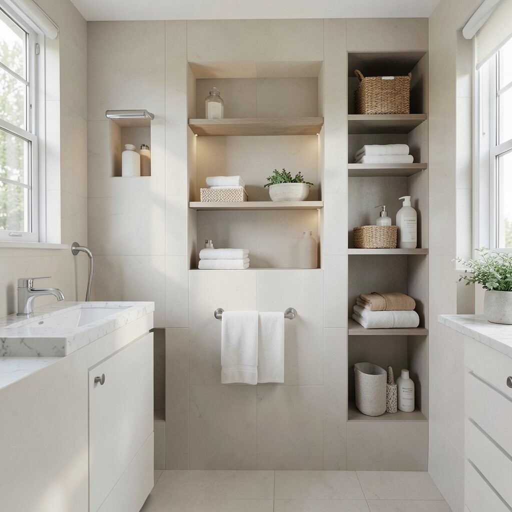 This storage idea feels special because it blends right into the wall. It gives the bathroom a custom look that many people love in newer homes and spa-style spaces.