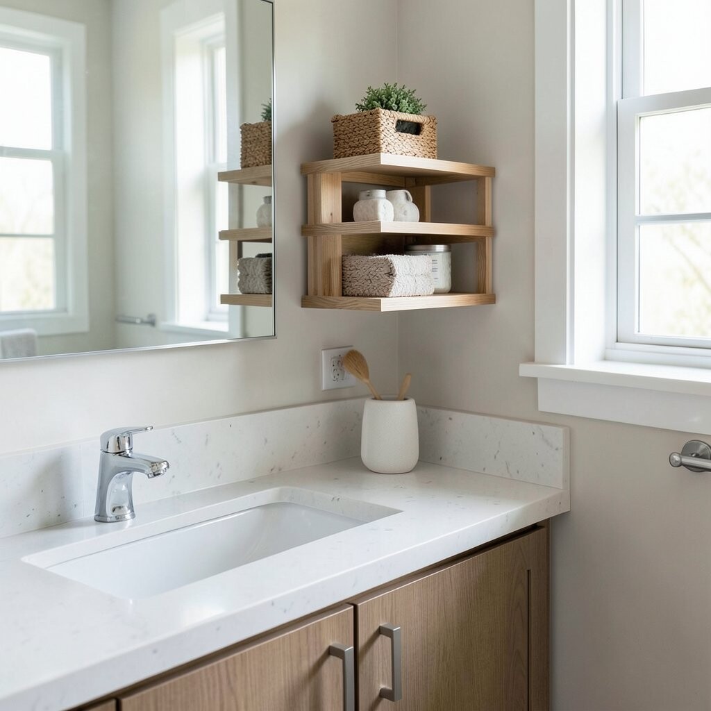 Open shelves near the sink give you quick access to things you use every day. They can hold hand towels, baskets, jars, and a few pretty extras.