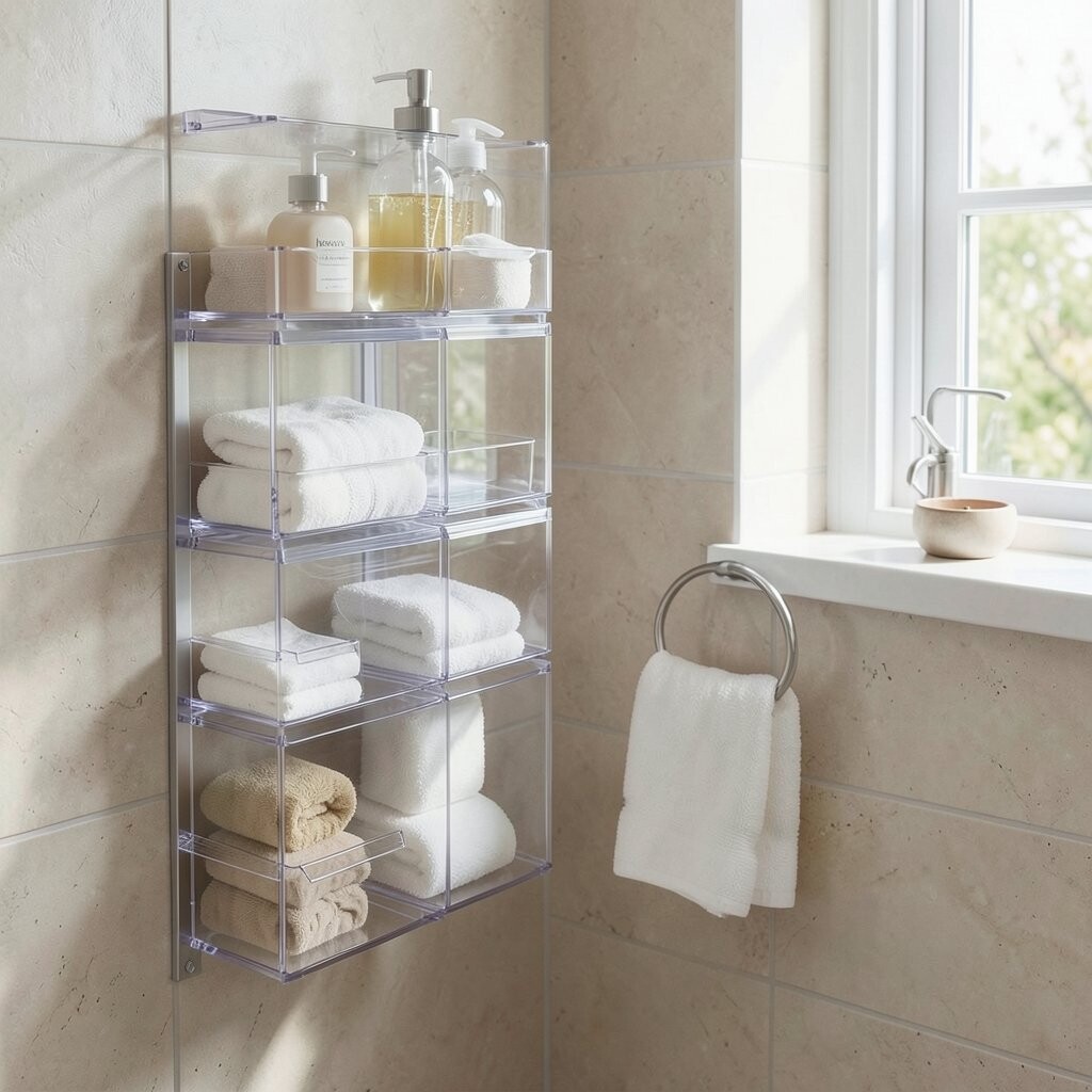 The see-through look gives the bathroom a bright, tidy feel. It is also useful because it keeps everything easy to grab without opening lots of boxes.