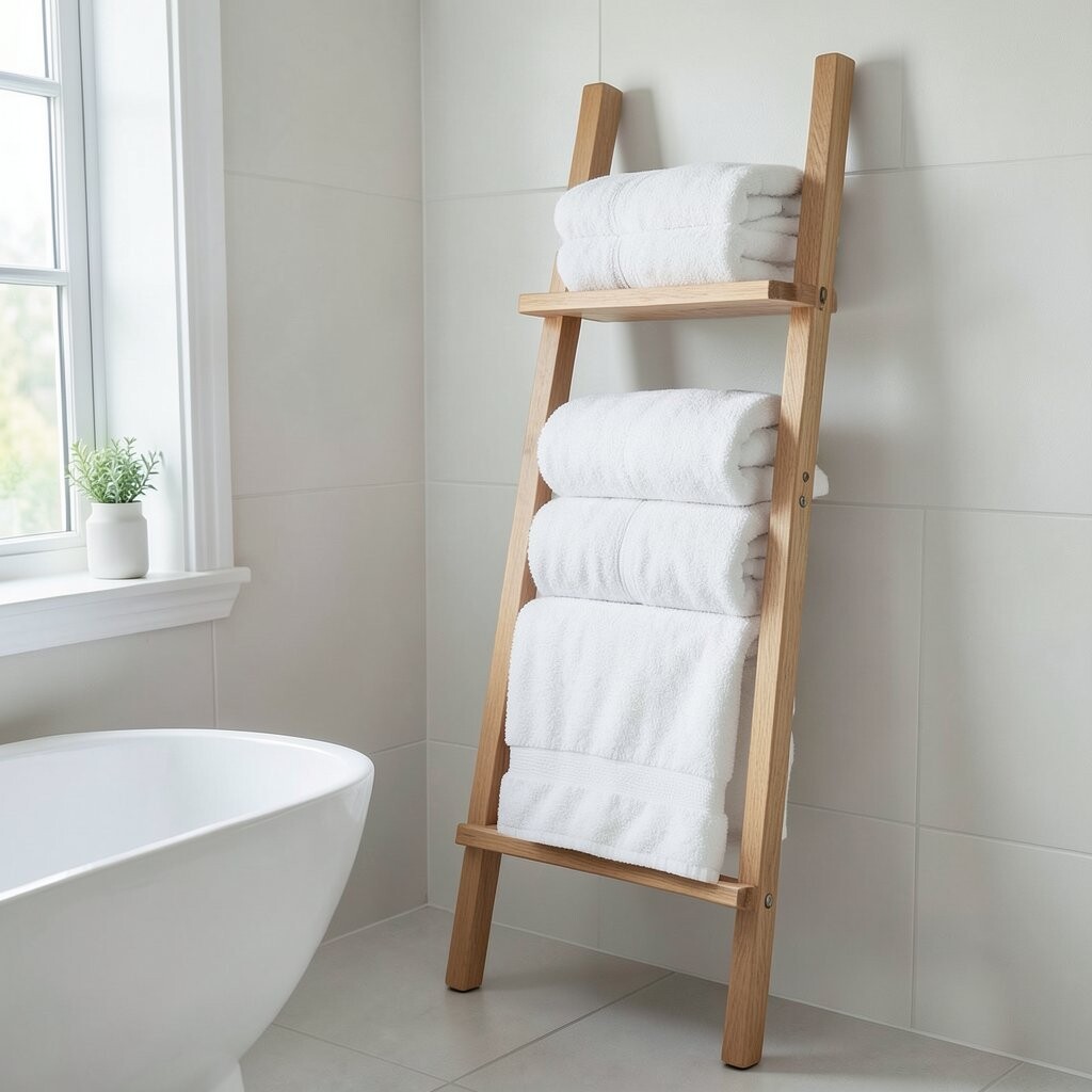 Pick a painted ladder for a clean look or a wood one for a spa vibe. If you like decorating with color, use towels in soft matching shades to make the shelf feel polished.