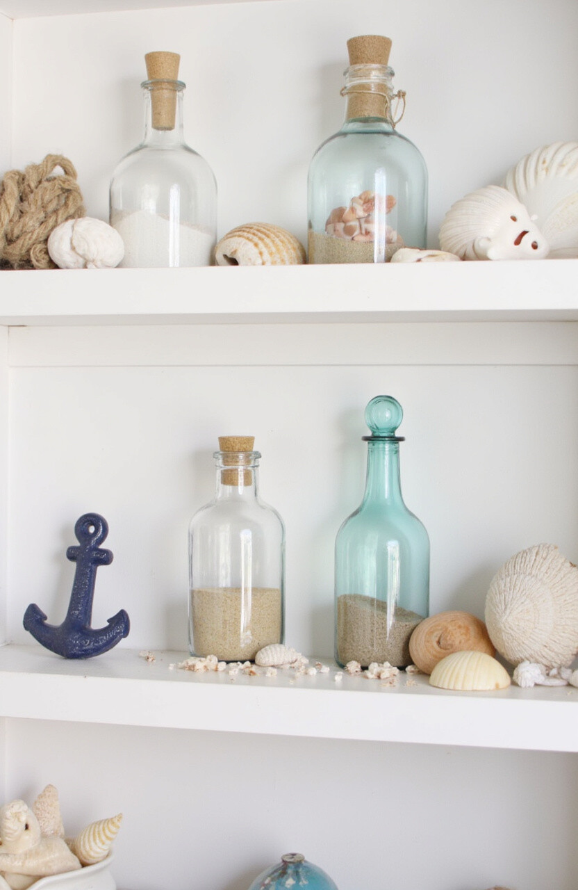 Capture the essence of the ocean with a coastal nautical theme. Use glass bottles filled with sand, seashells, and miniature anchors.