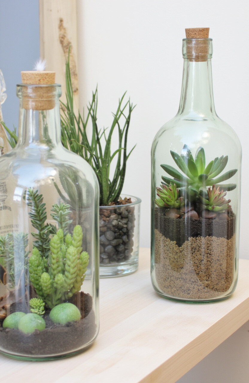 Turn your bottles into mini terrariums filled with succulents or air plants. These require little maintenance and look stunning.
