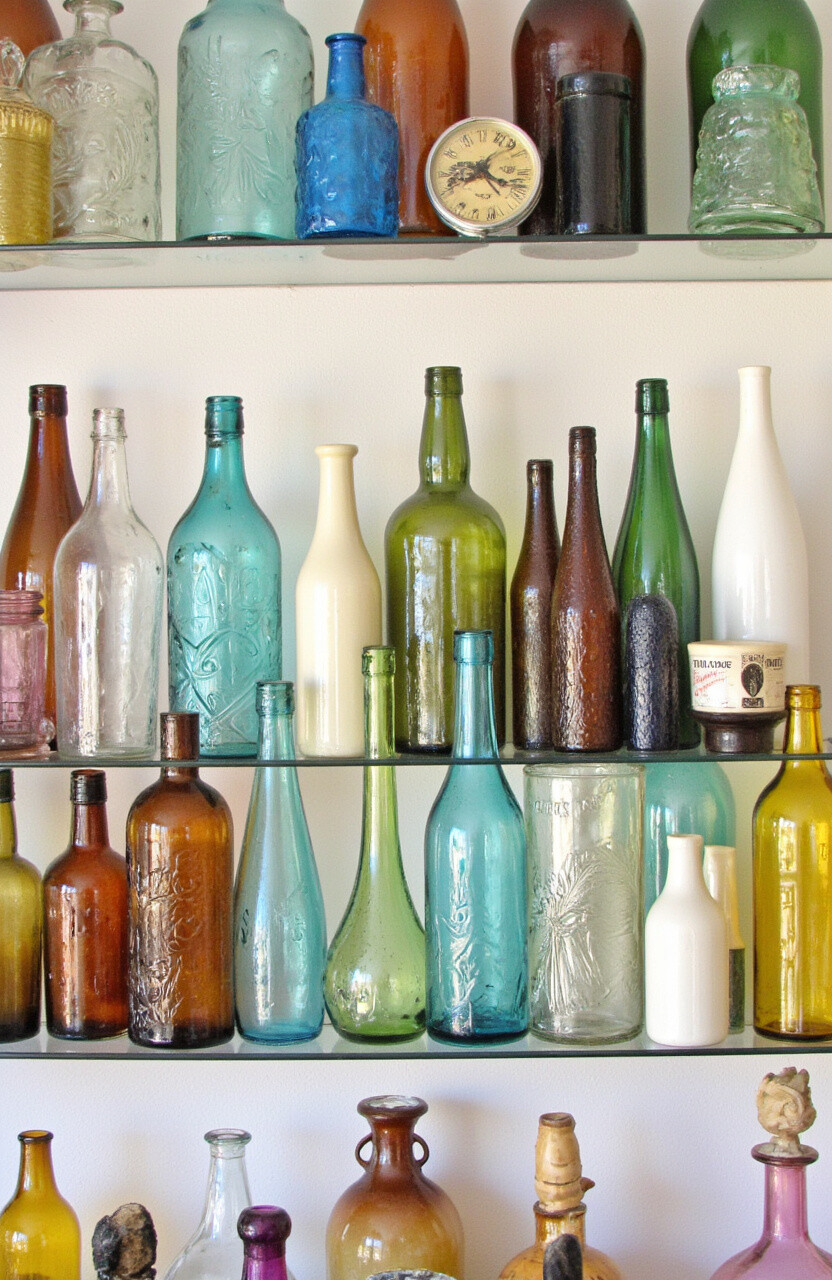 Give your shelf an old-world charm with vintage glass bottles. These bottles, with their delicate curves and colorful tints, add a touch of nostalgia and sophistication.