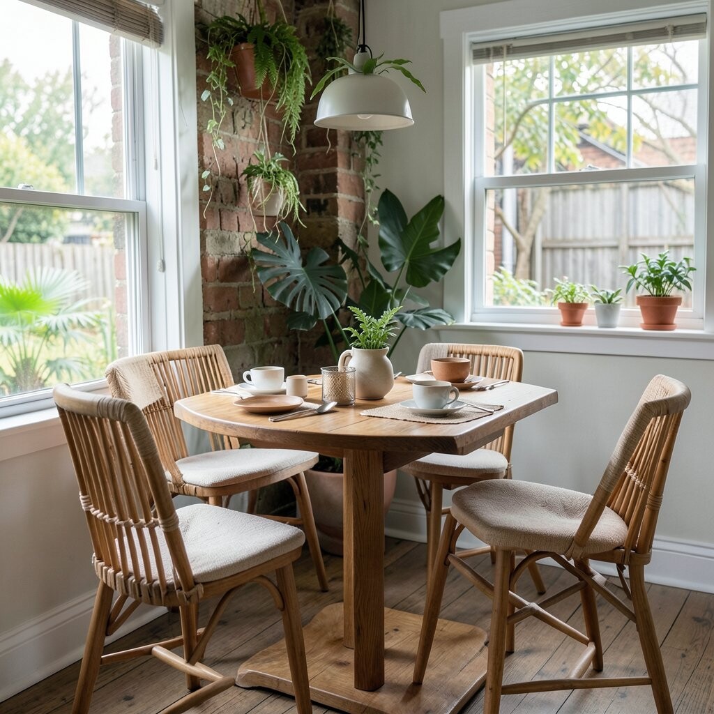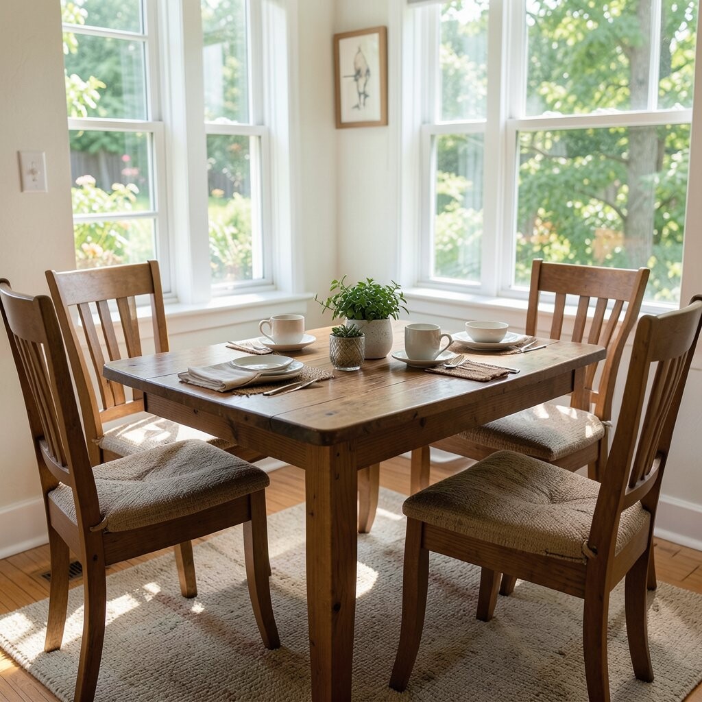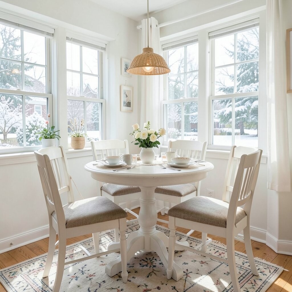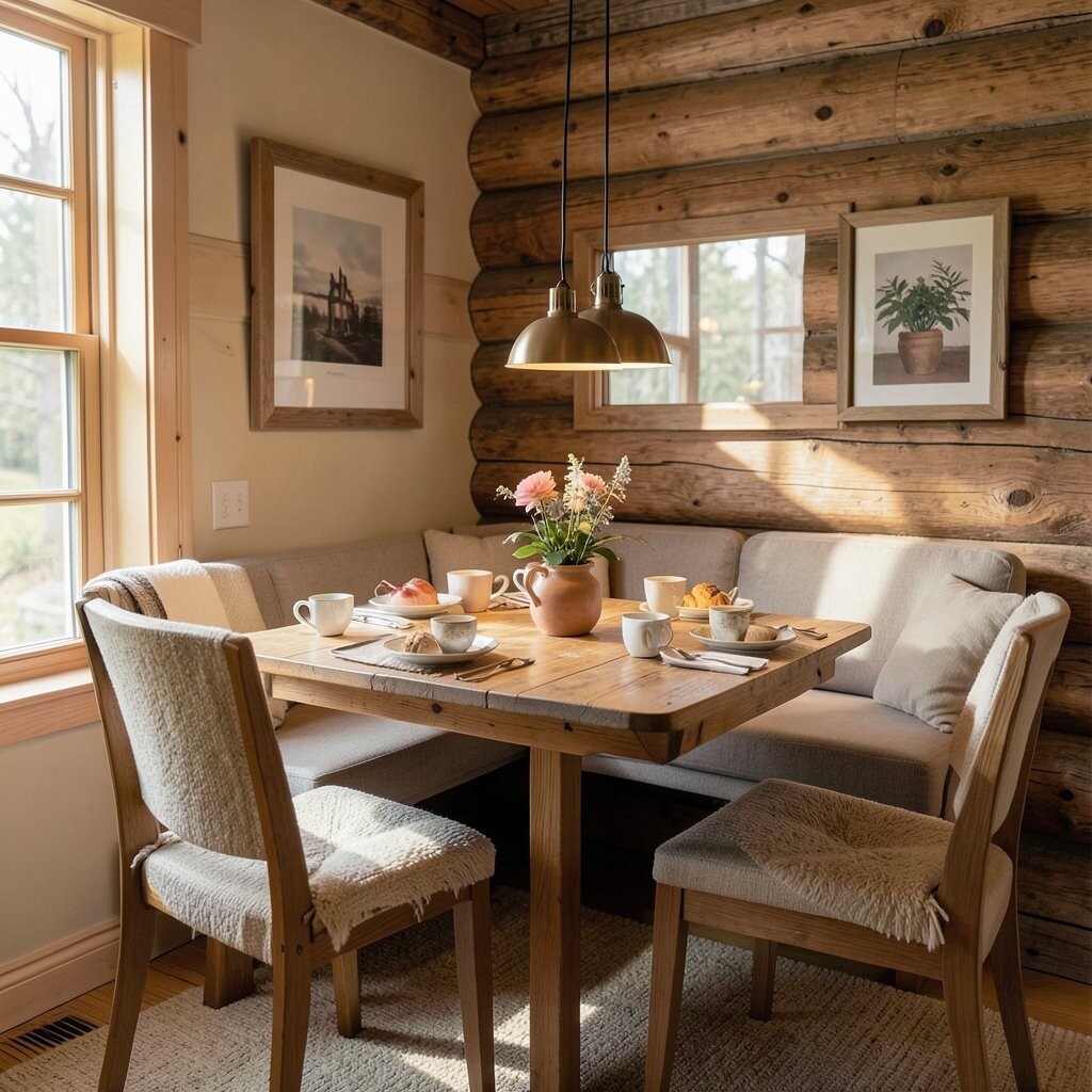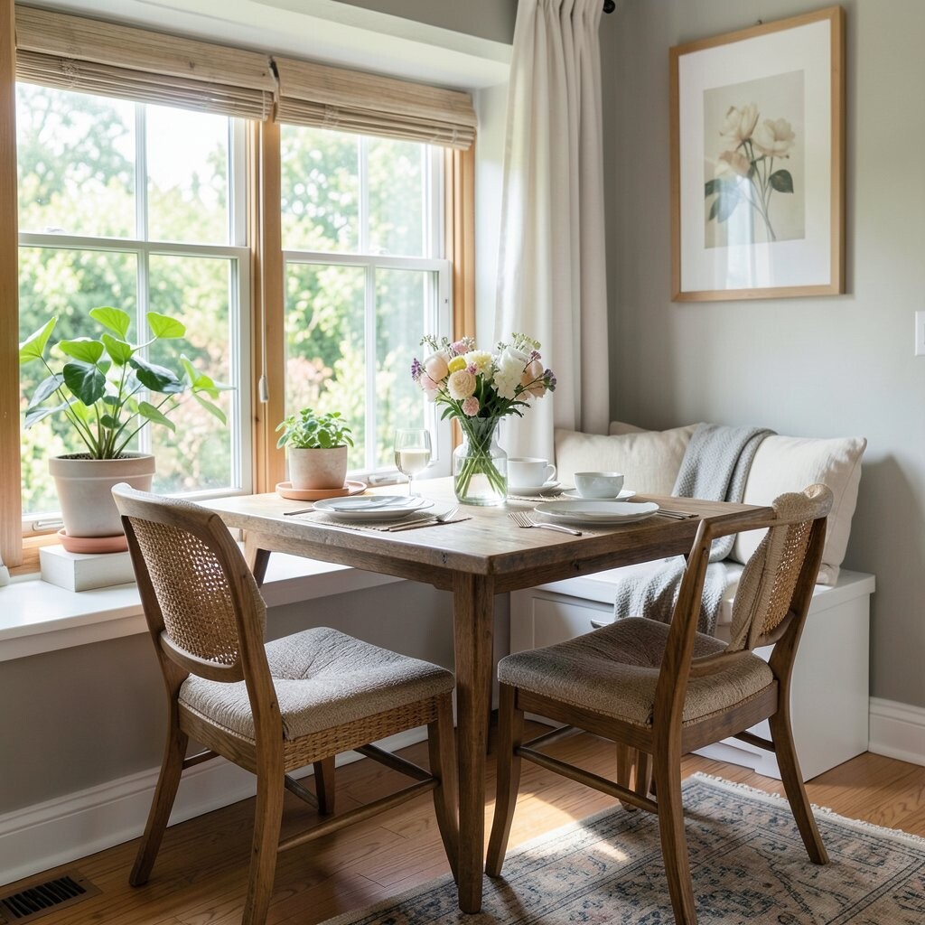 This setup invites natural light, making breakfast time feel more vibrant. It’s an ideal spot for those who love sunshine. Use colorful pillows to personalize it.
