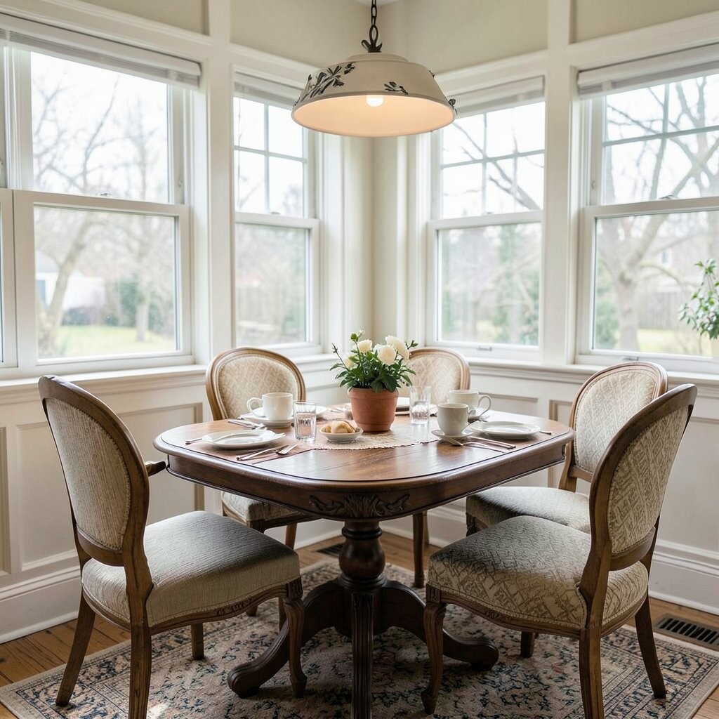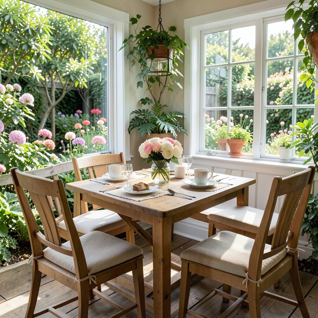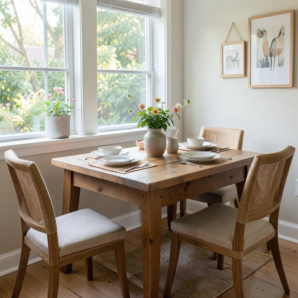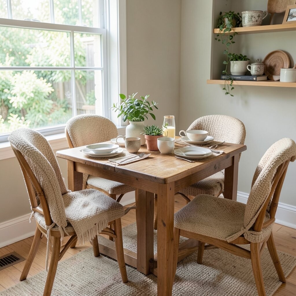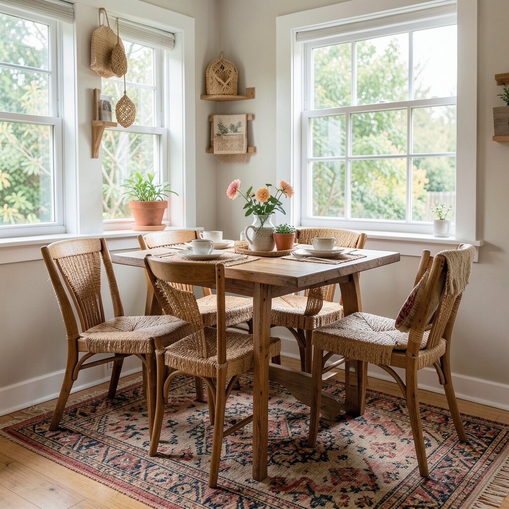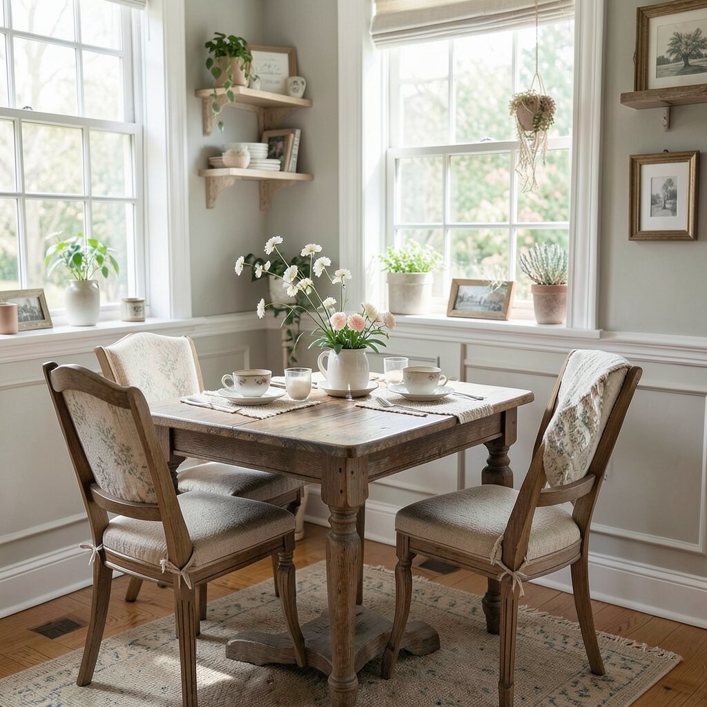 This setup invites natural light, making breakfast time feel more vibrant. It’s an ideal spot for those who love sunshine. Use colorful pillows to personalize it.