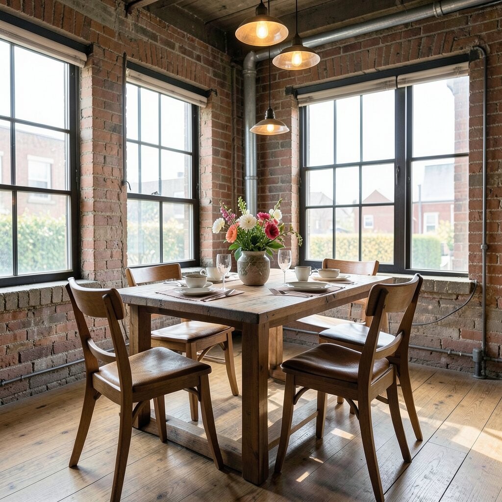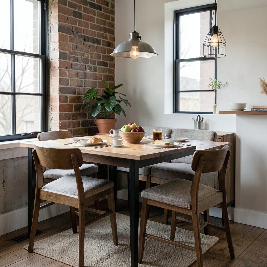 Exposed brick, metal accents, and open space create a trendy loft vibe. It’s both modern and cozy.