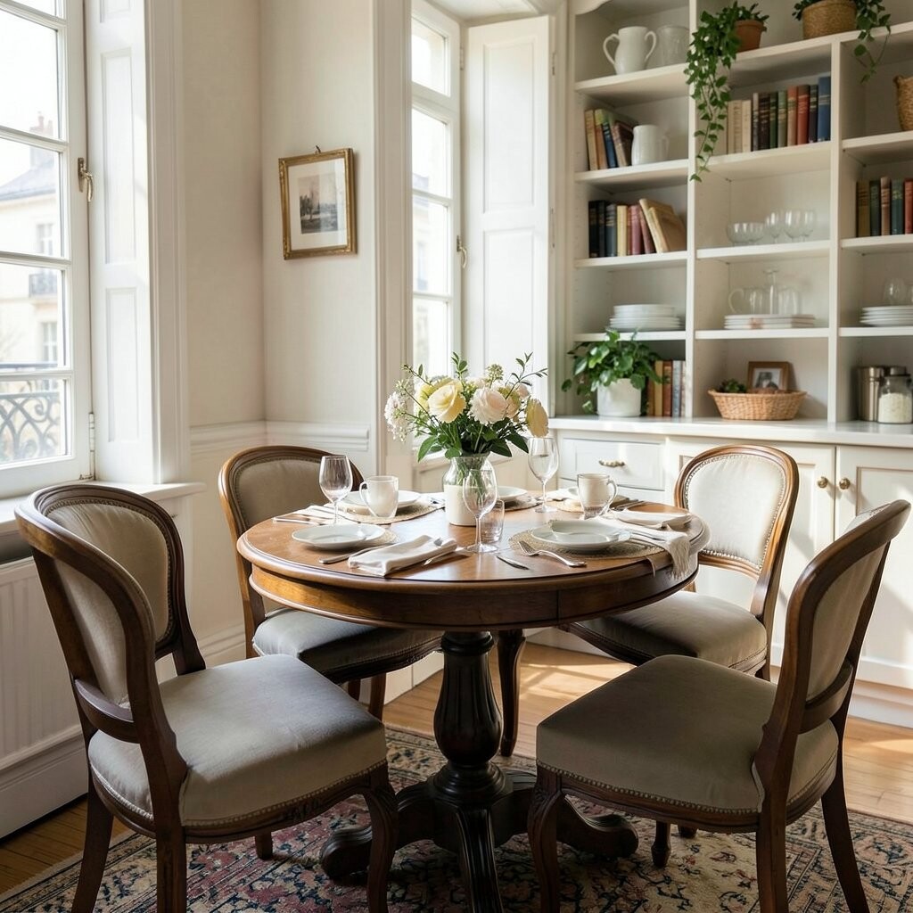 Think sleek lines and minimal decor. A simple table with clear chairs can make a small space feel larger.