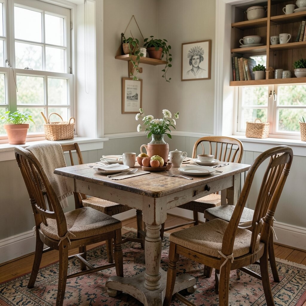 Rustic tables and chairs with soft, worn finishes create that welcoming farmhouse vibe. Add some vintage decor to complete the look.