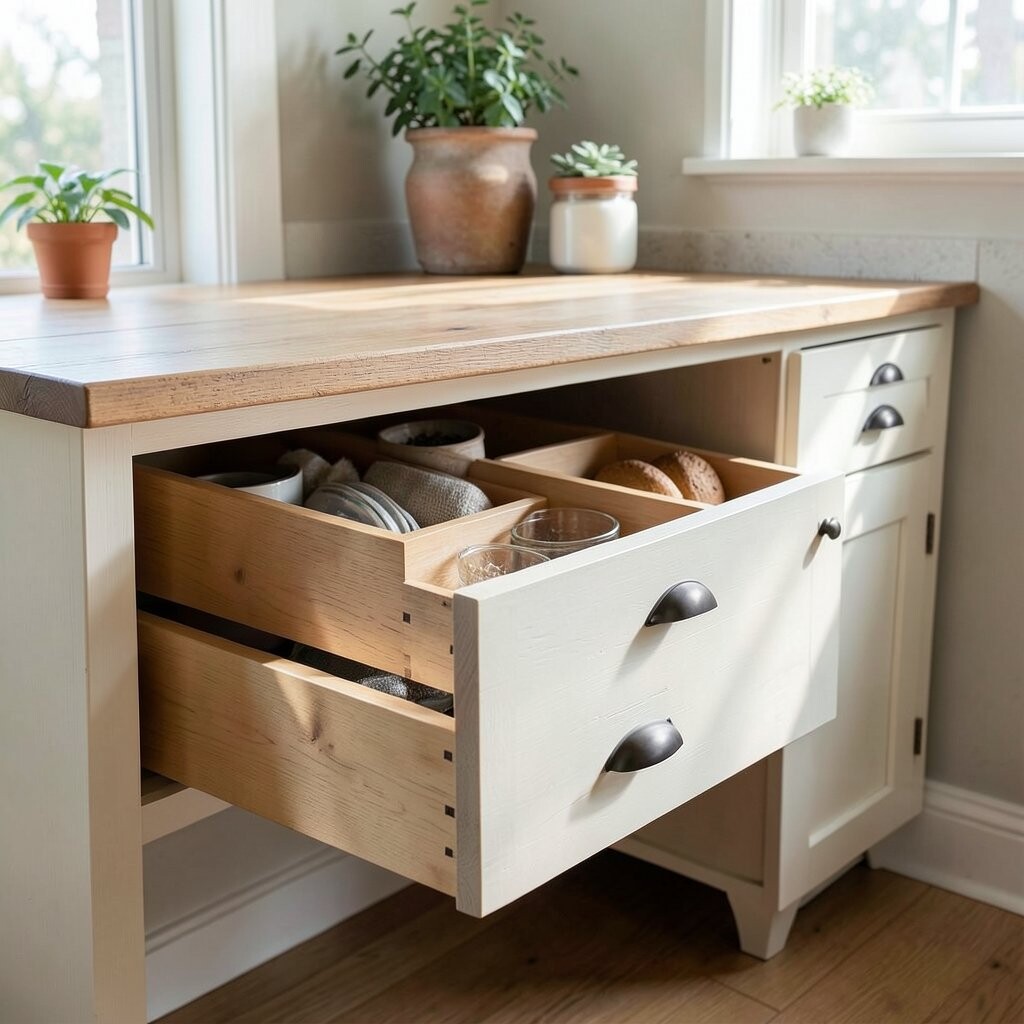 Customized drawer dividers keep everything in its place, from cutlery to napkins. They make it easy to find what you need quickly.