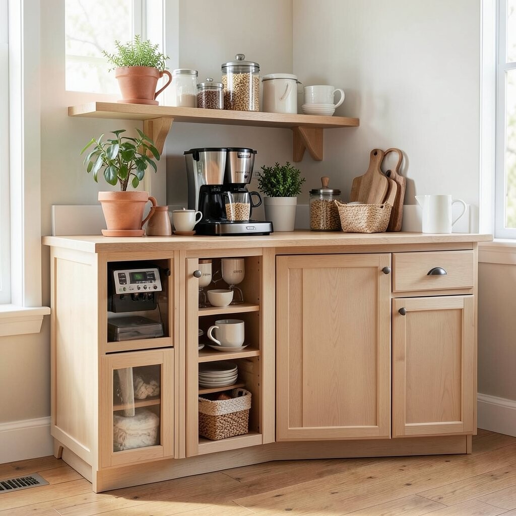 A dedicated coffee station cabinet can keep all your coffee essentials in one place. It’s perfect for coffee lovers who want a neat and organized space.