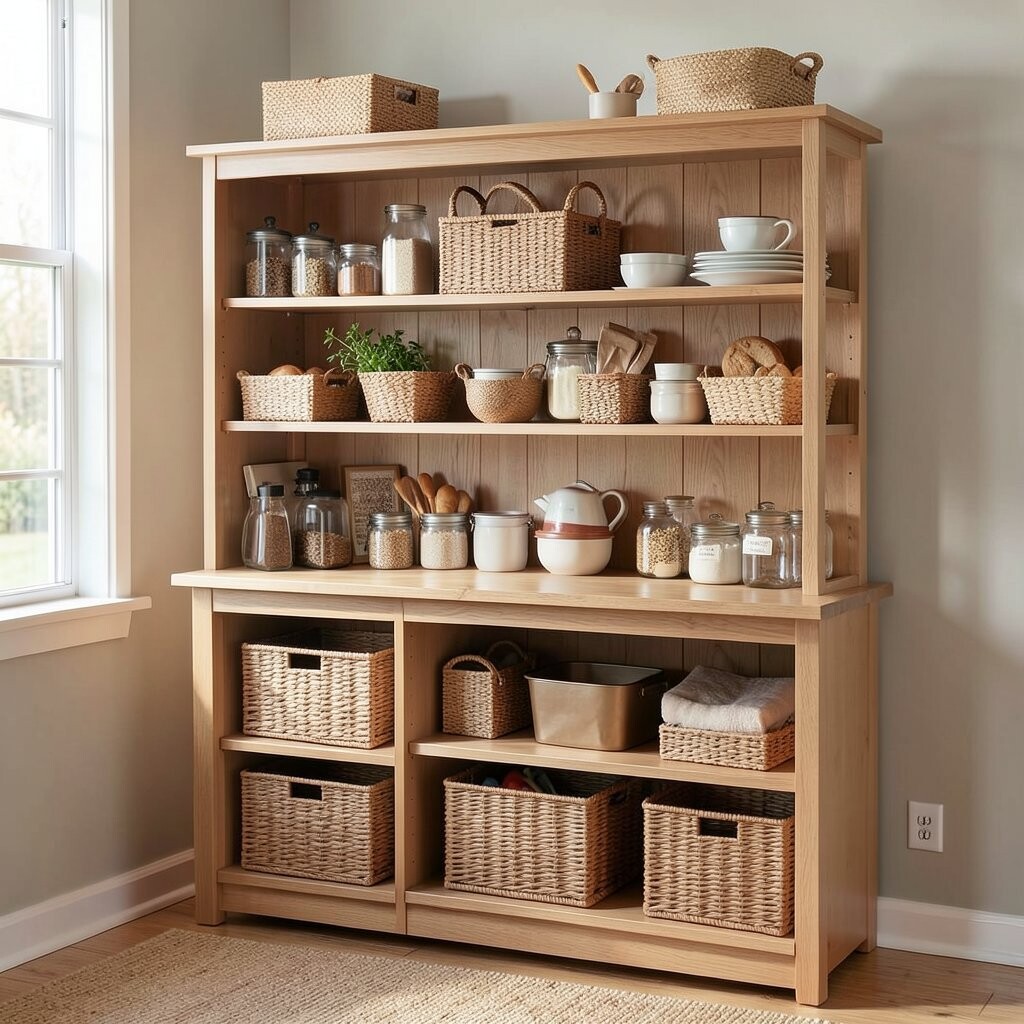 Choose baskets in different materials like wicker or metal to match your decor. They’re easy to slide in and out, keeping everything organized but within arm’s reach.