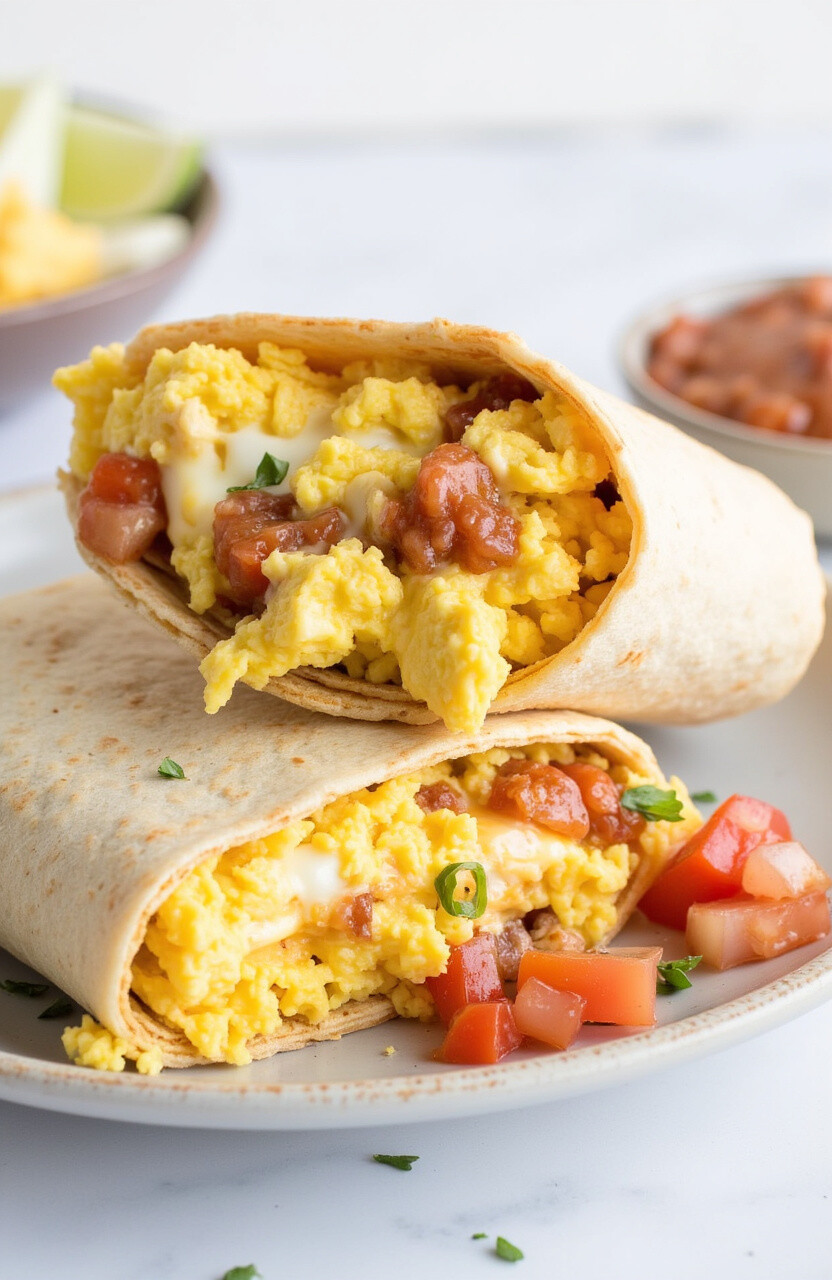 Fill tortillas with scrambled eggs, cheese, salsa, and your choice of protein. They’re portable, fun, and perfect for a grab-and-go option. It’s a hearty meal that won’t break the bank.