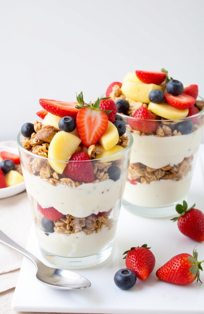 Layer granola, yogurt, and your favorite fruits in a glass for a beautiful presentation. It’s quick, easy, and perfect for those who prefer something on the lighter side. Plus, it’s a feast for the eyes!