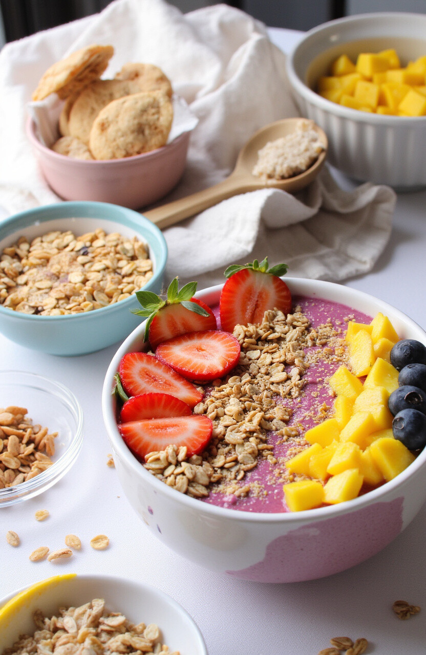 Blend your favorite fruits, then top with granola, seeds, and fresh fruit slices. It’s like eating a rainbow! It’s a creative way to enjoy a nutritious meal, and the toppings can be personalized for every guest.