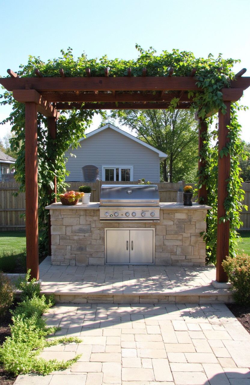 A pergola-covered grill offers shade and style. It creates a defined space for cooking and socializing.