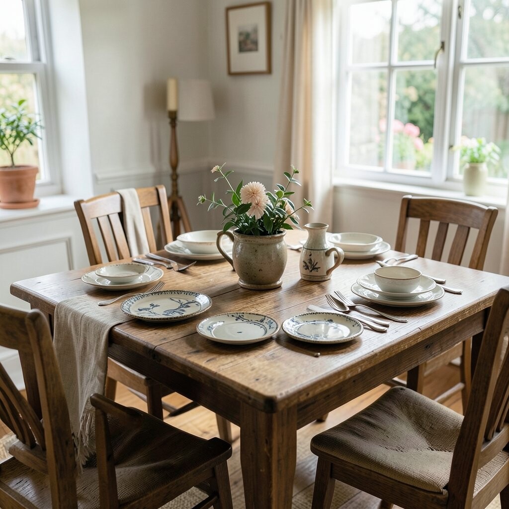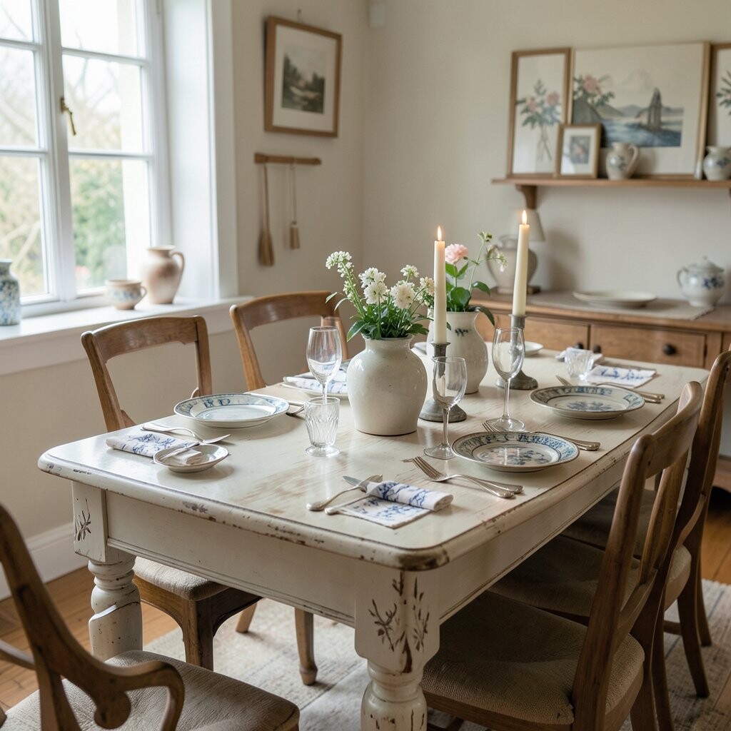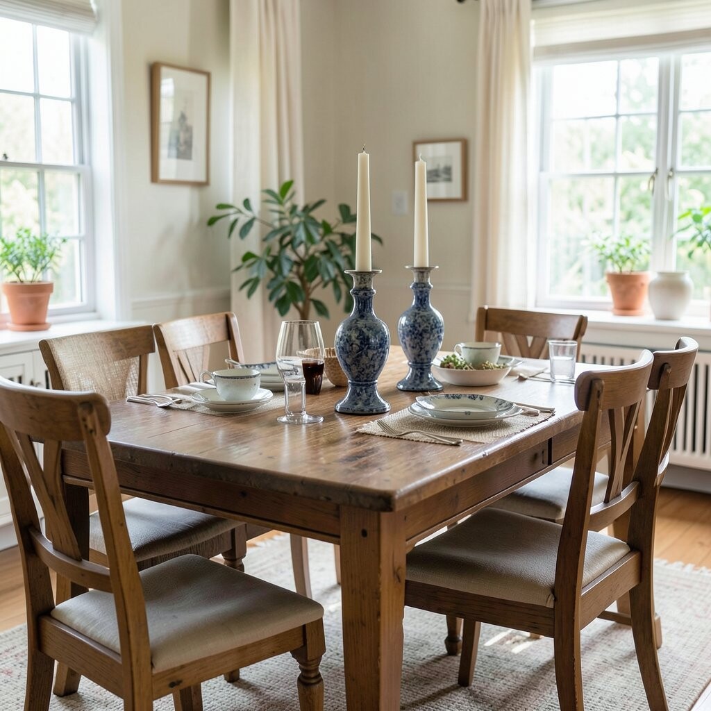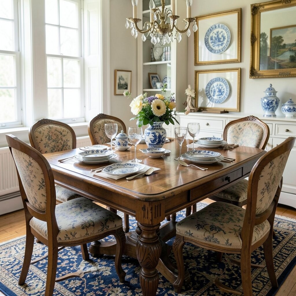 Blue and white plates are easy to find at antique stores and flea markets. They’re versatile and can match almost any color scheme. Pair them with a wooden table for a warm, inviting look. Usually, they aren’t very expensive, a budget-friendly way to add elegance.