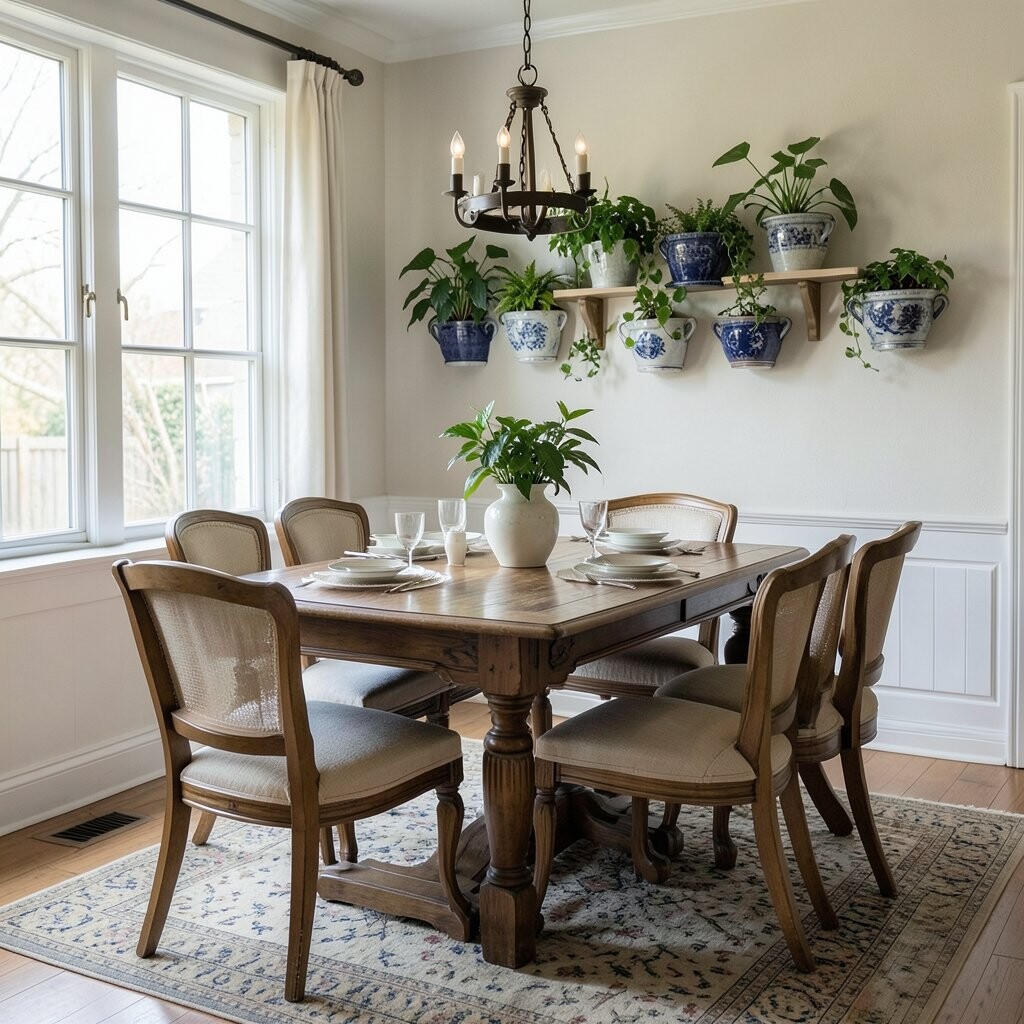 Ceramic wall planters can add greenery and life to your dining room walls. The combination of plants and ceramic textures can create a vibrant, fresh look. They’re perfect for small spaces.