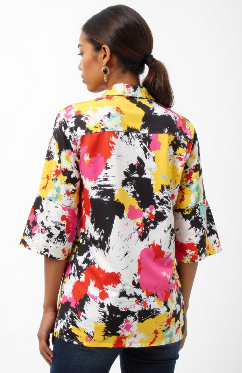 Abstract prints are often colorful, so pair them with neutral pants. Each piece is unique, reflecting an artistic soul. Prices are moderate, typically $30 to $45.